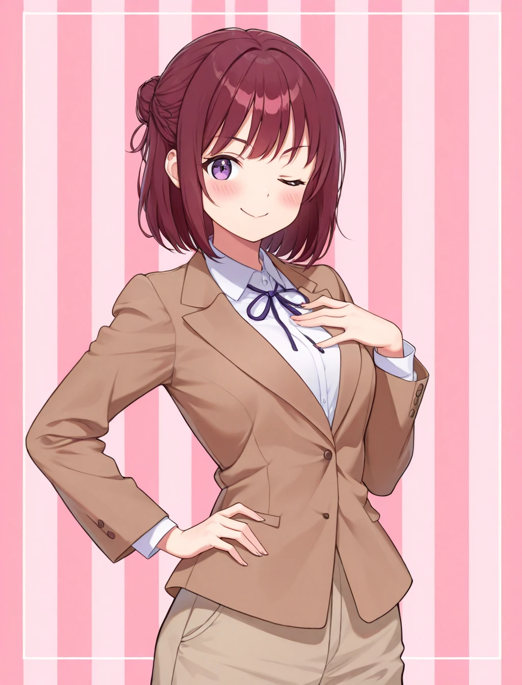 brown jacket, brown pants, neckbow, white shirt, closed jacket