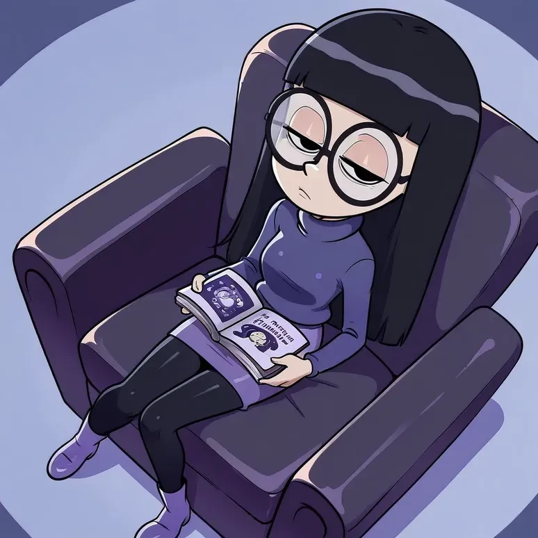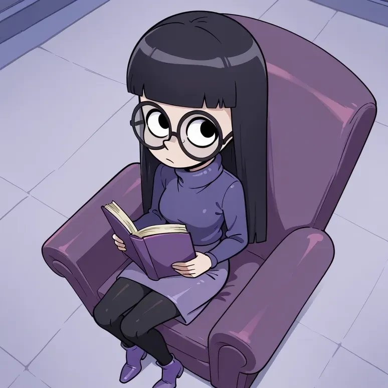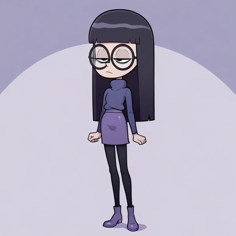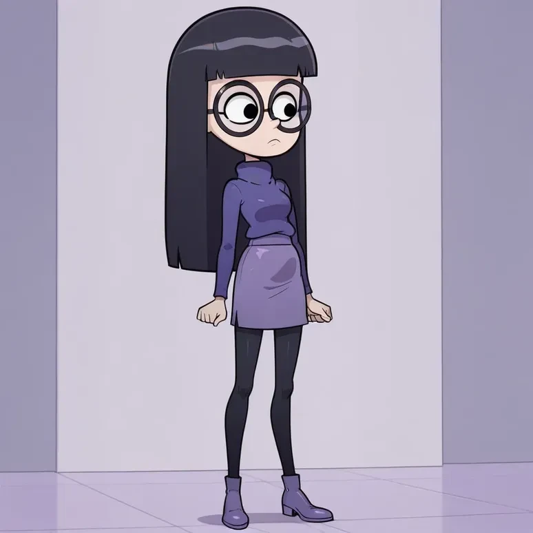 clothes: glasses, turtleneck sweater, skirt, black pantyhose, purple footwear.
