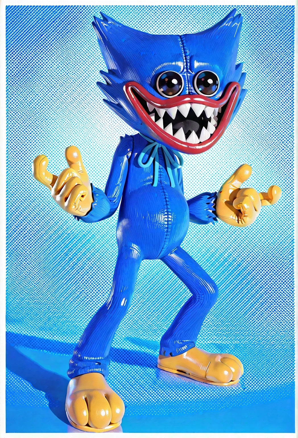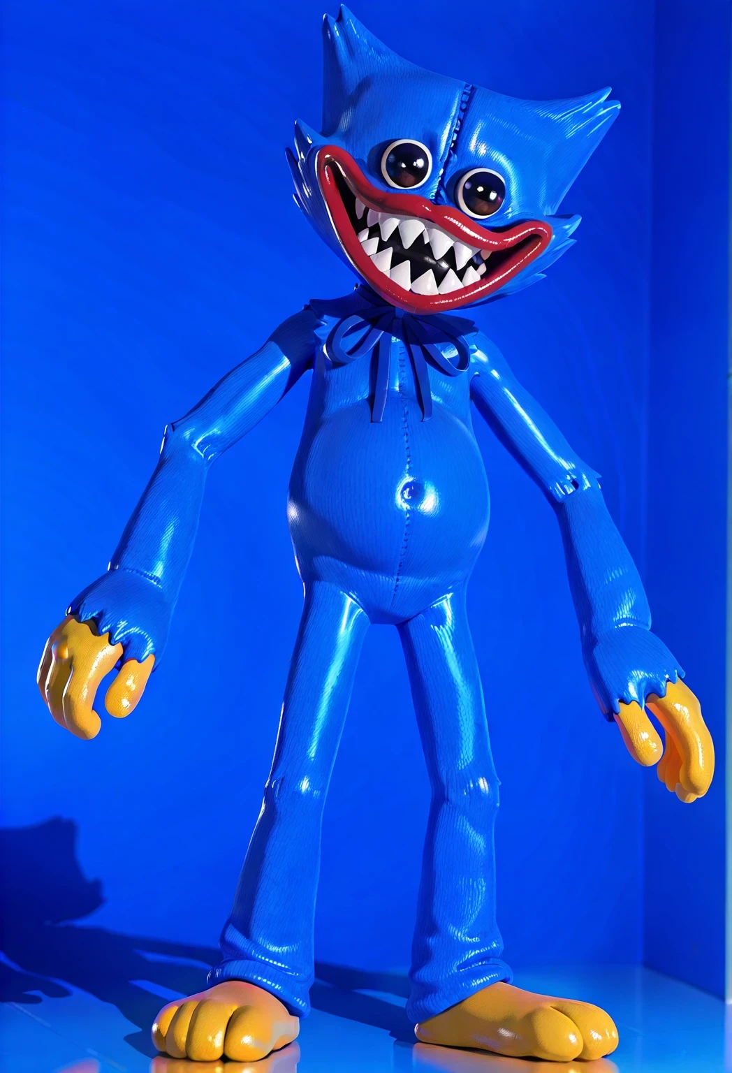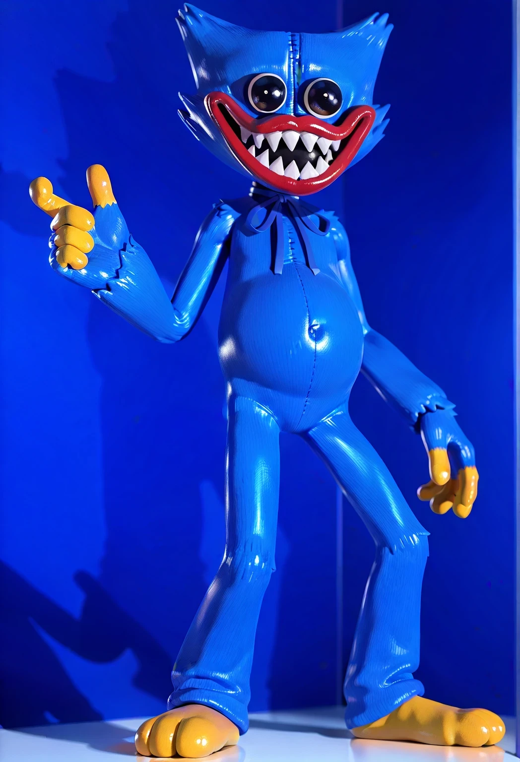 HuggyWuggyFNFC, 1boy, long limbs, blue body, blue fur, sharp teeth, large blue neck ribbon, dark red lips, red lips, plump lips, large black eyes, yellow fingers, yellow feet, 3d render, huggy wuggy,