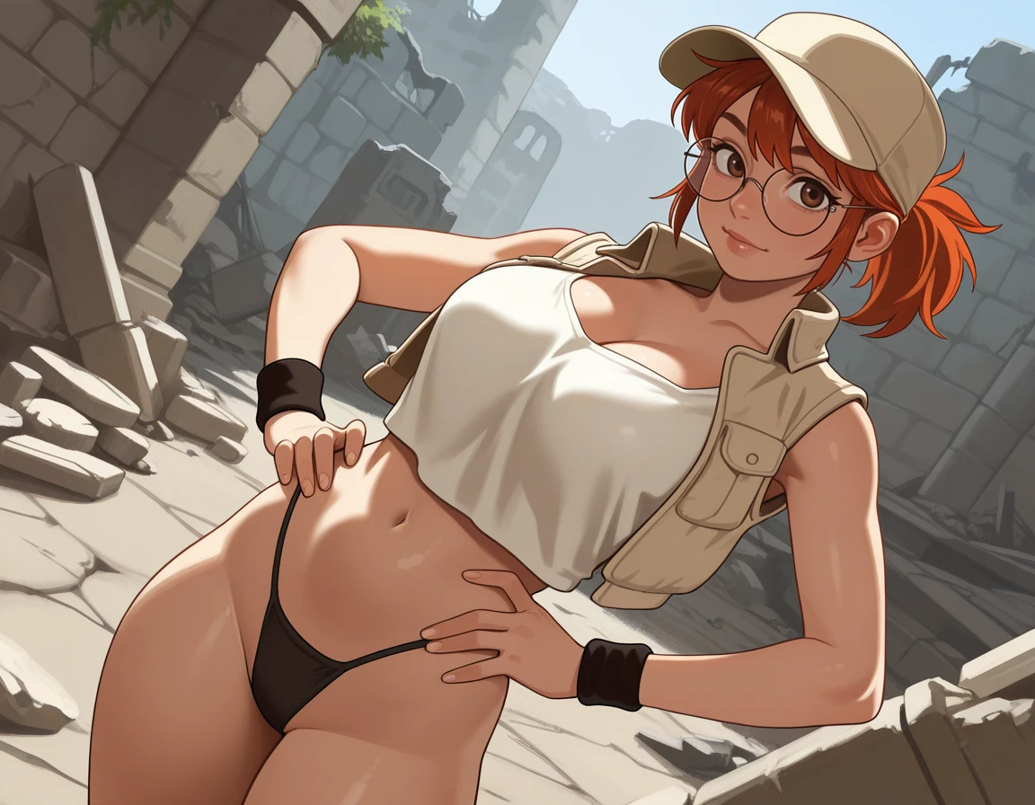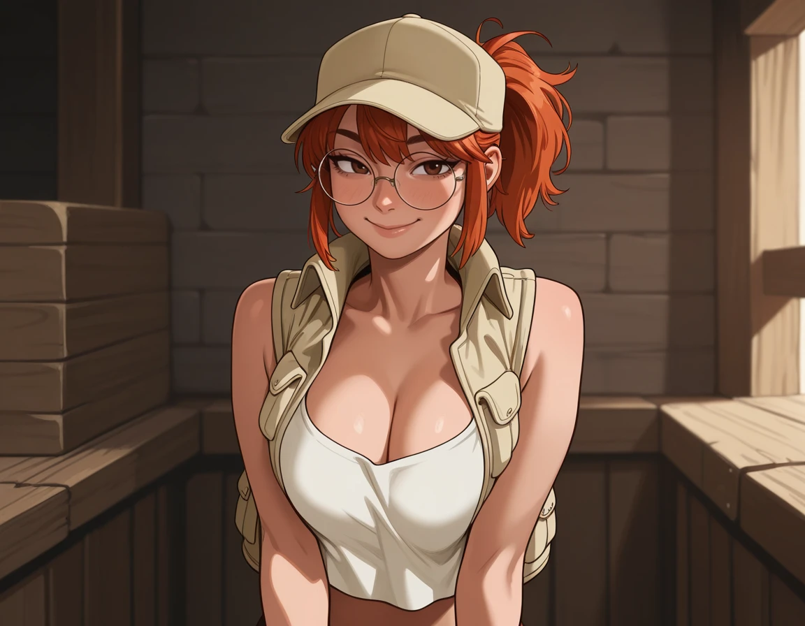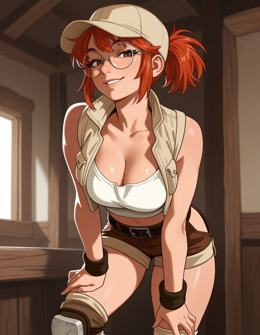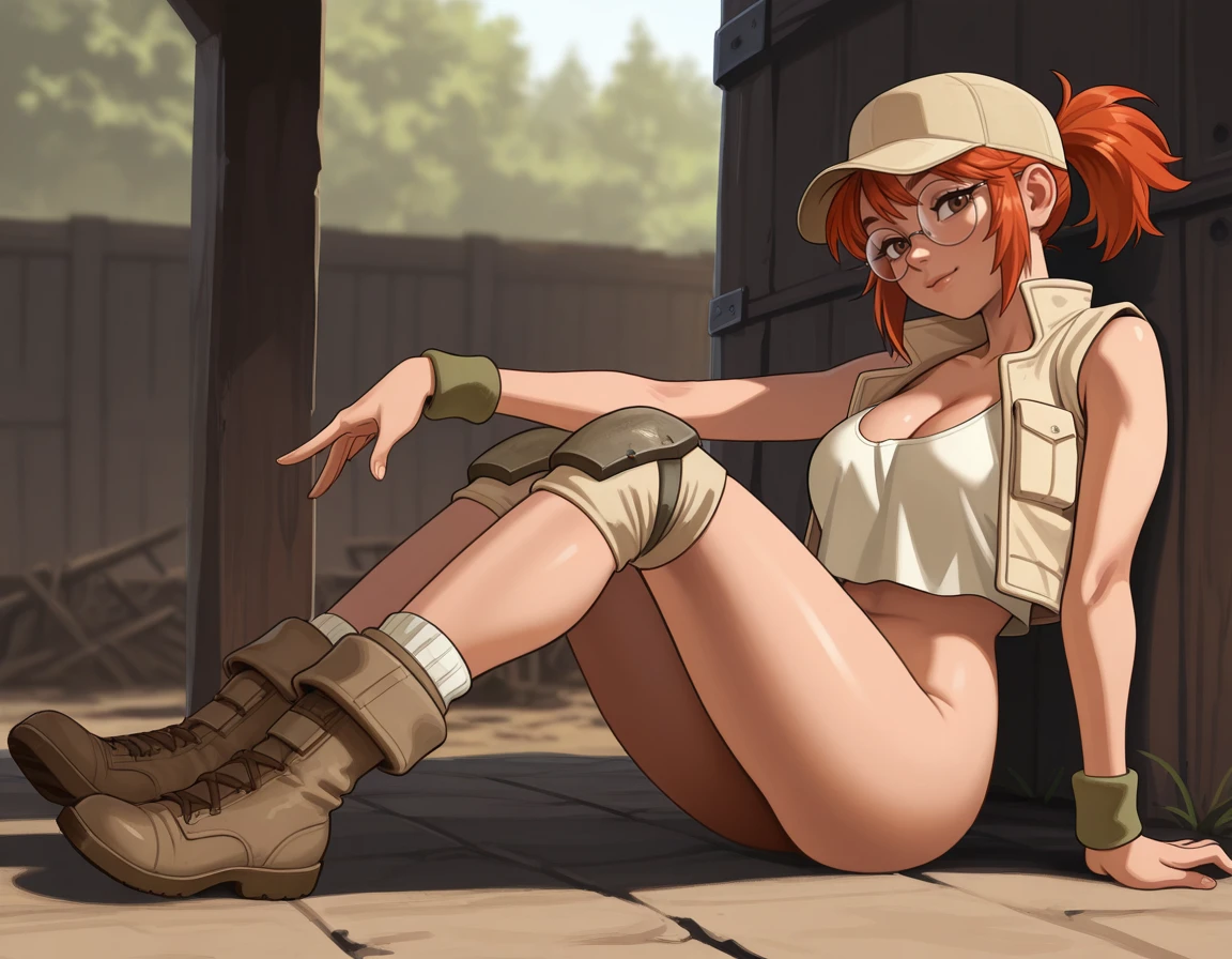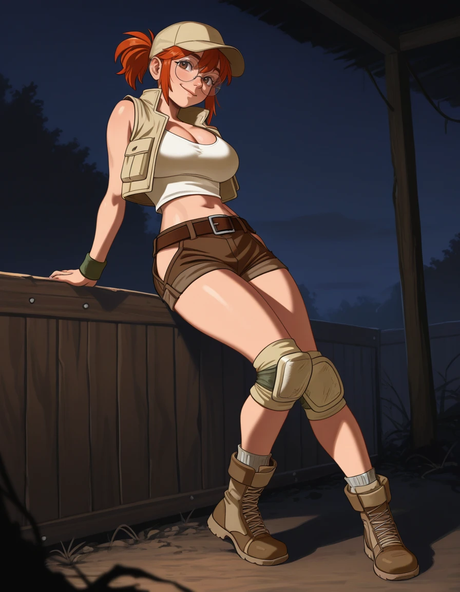 Positive prompt: 1girl, MSFio, hat, short auburn ponytail, brown eyes, glasses, round eyewear, beige vest, crop top, sleeveless, wristband, belt, brown shorts, short shorts, hip vent, knee pads, boots