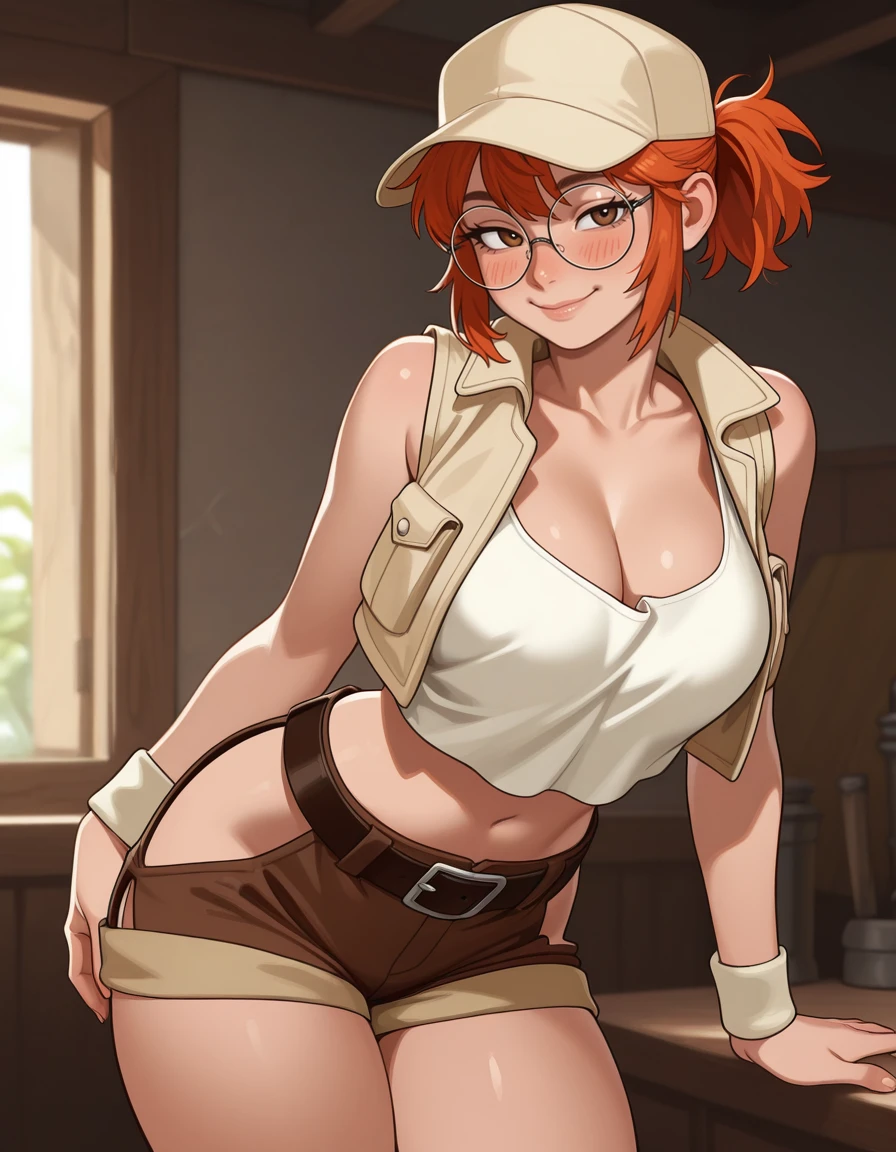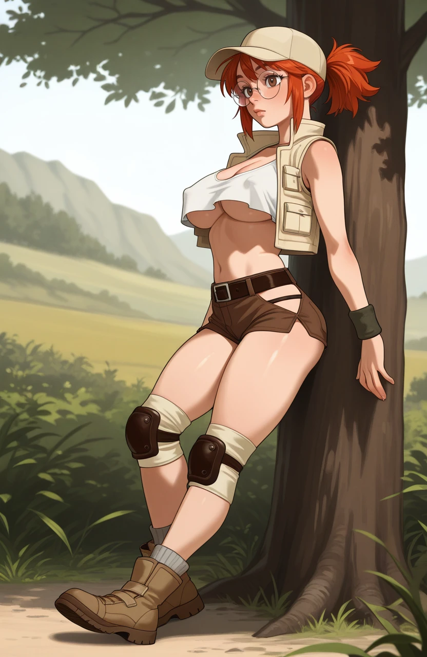 1girl, MSFio, hat, short auburn ponytail, brown eyes, glasses, round eyewear, beige vest, crop top, sleeveless, wristband, belt, brown shorts, short shorts, hip vent, knee pads, boots