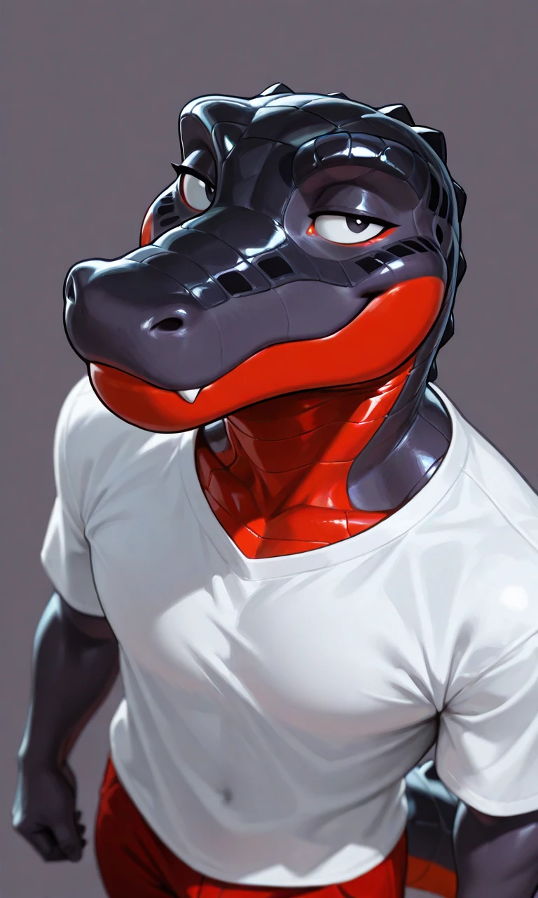 Del-AC, Crocodile, tail, black eyes, half open eyes, fang out, dark purple-grey skin, rich red abdomen, rich red bottom jaw, Multi-colored skin, metallic skin, square hole on side of face, white shirt with blue stripeAlso you can use : 1male, solo, claw, full body
