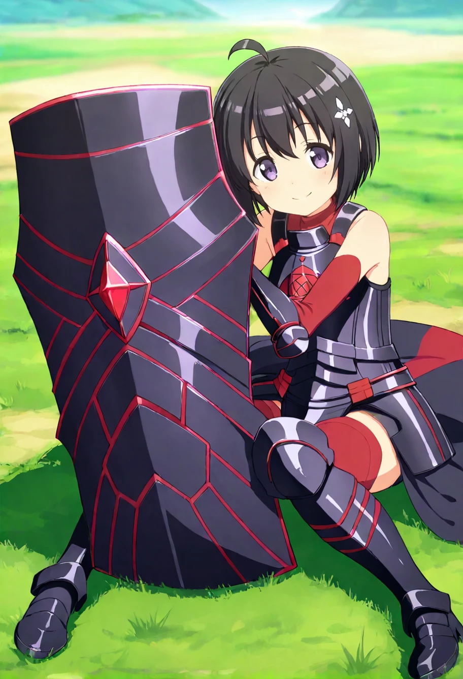 maple-default,maple \(bofuri\),purple eyes,black hair,short hair,ahoge,hair ornament, black armor, detached sleeves,black gloves,armor boots,red legwear