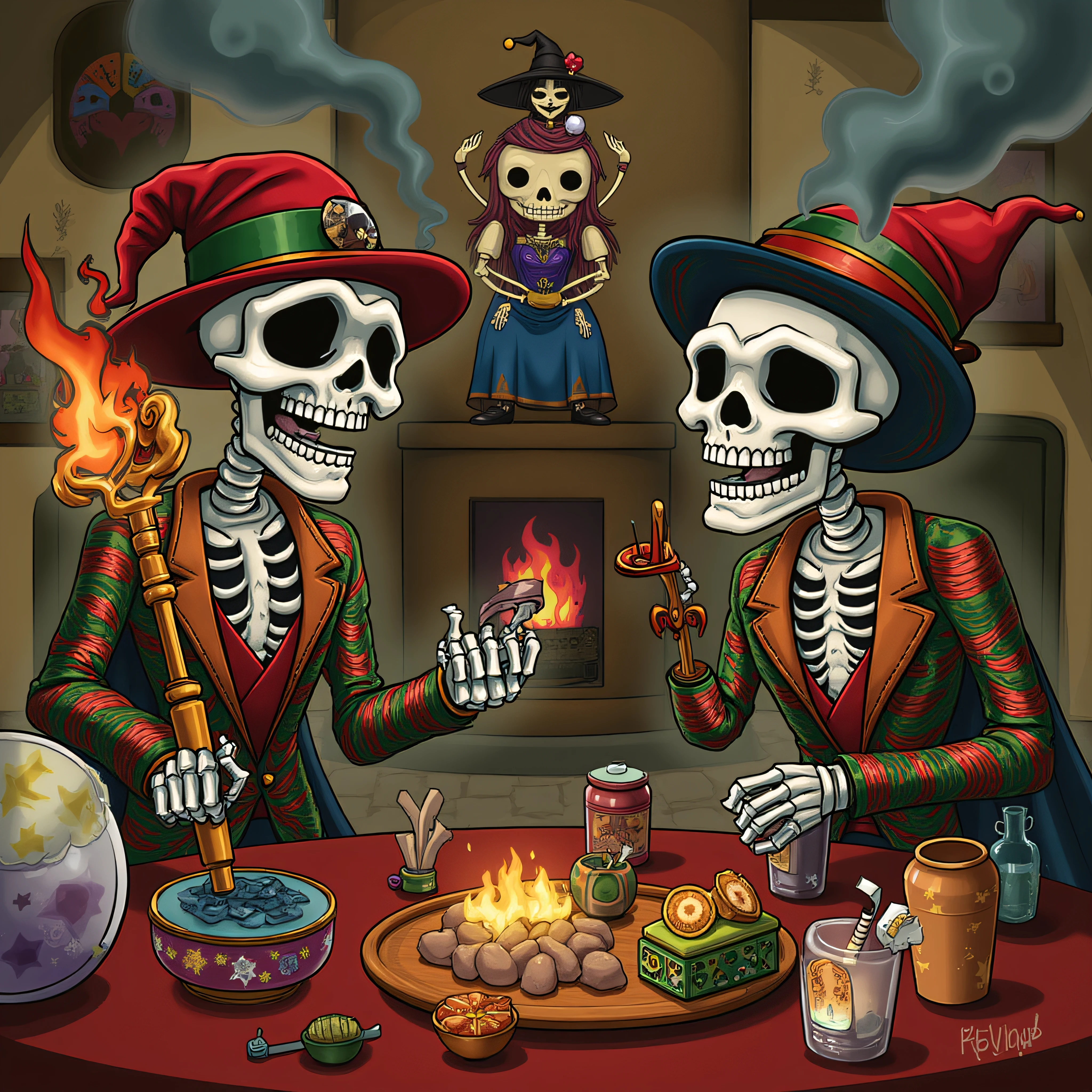 In a shadowy realm where the veil between the living and the spectral is thin, this eerie style emerges, transforming the macabre into something oddly delightful. Bold, dark outlines π€ carve out grinning skeletons and playful witches, their bones and cloaks glowing under the moonlit sky π. Vivid, unnatural colorsβpurples, oranges, and greensβflicker like jack-o'-lanterns π, casting an otherworldly glow.
