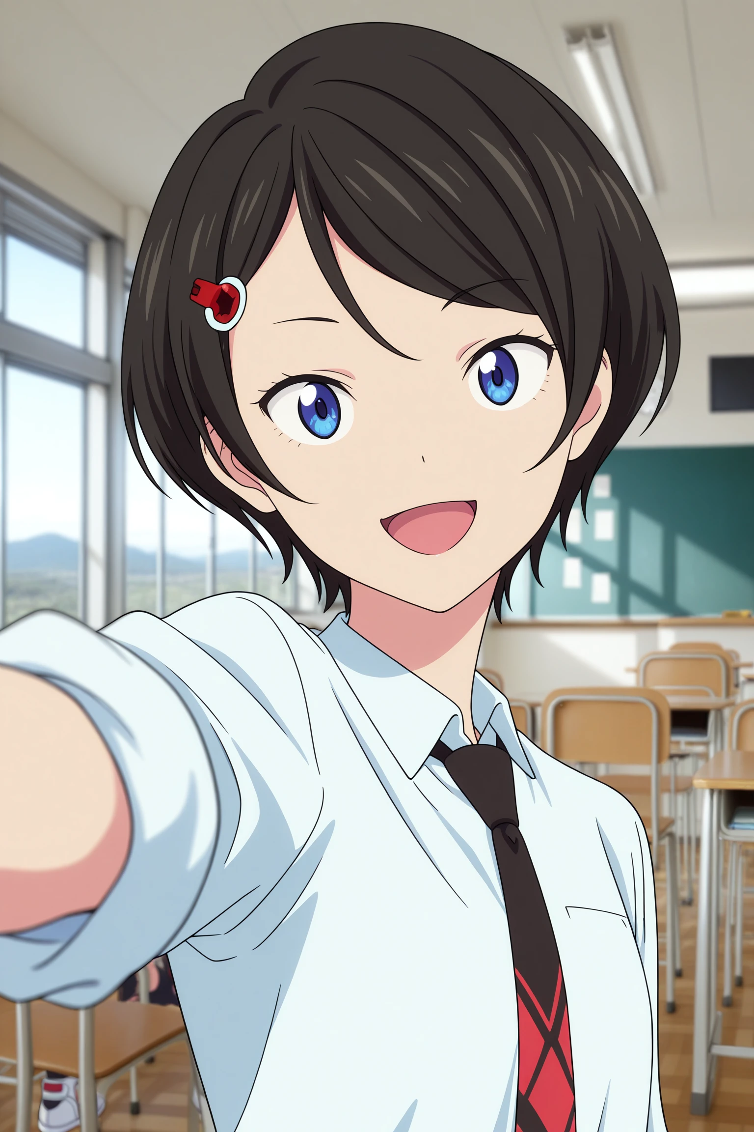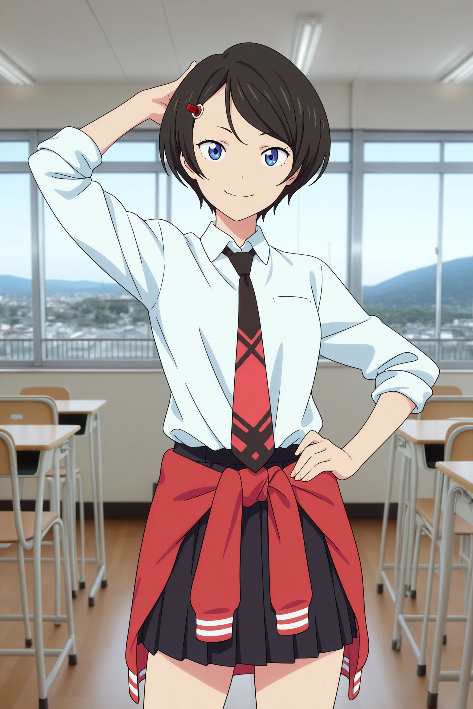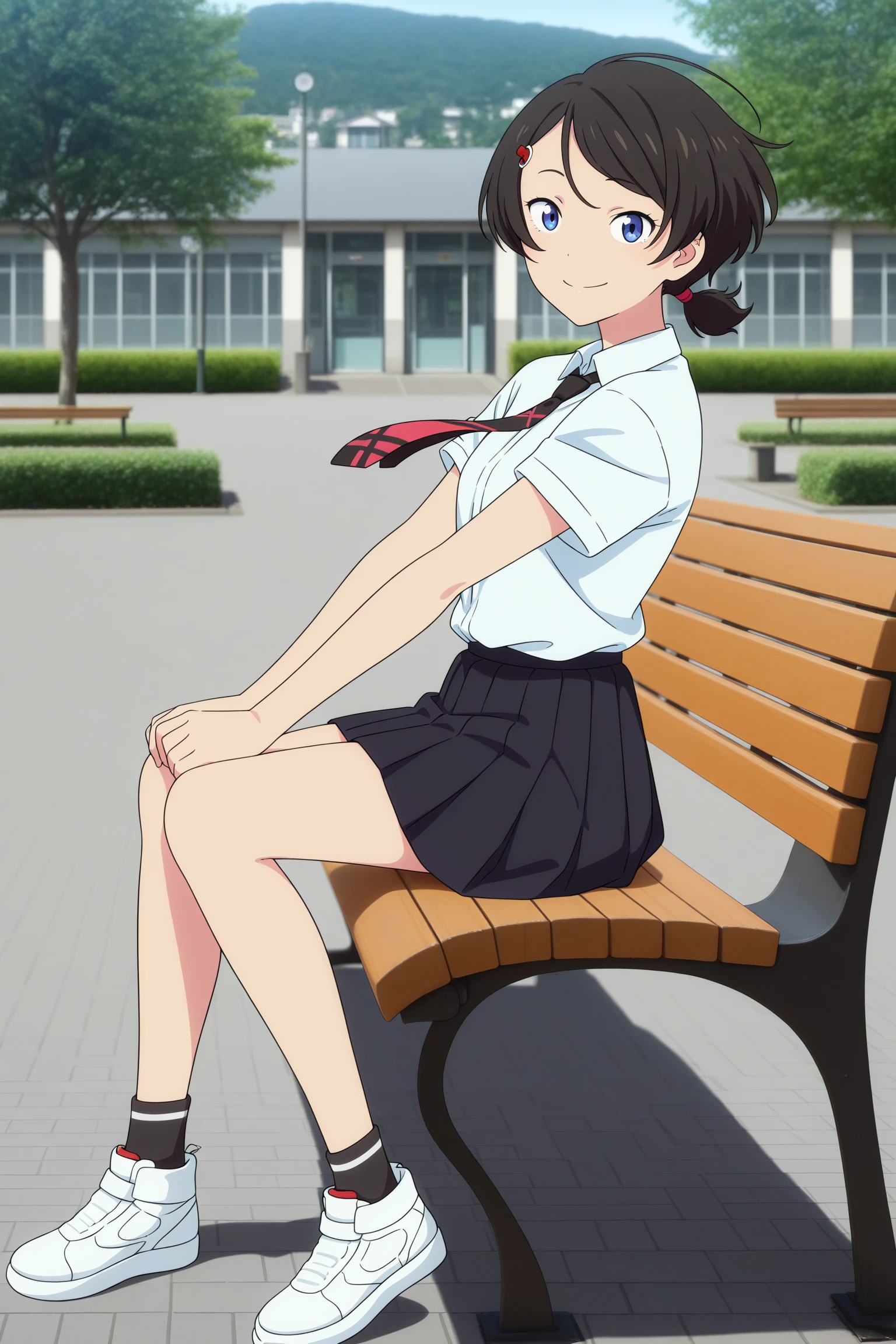 namiko, short hair, black hair, short ponytail, hair tie, parted bangs, hairclip, blue eyes, short sleeves, white shirt, collared shirt, black necktie, red necktie, loose necktie, black skirt, pleated skirt, black socks, striped socks, ankle socks, white footwear, sneakers