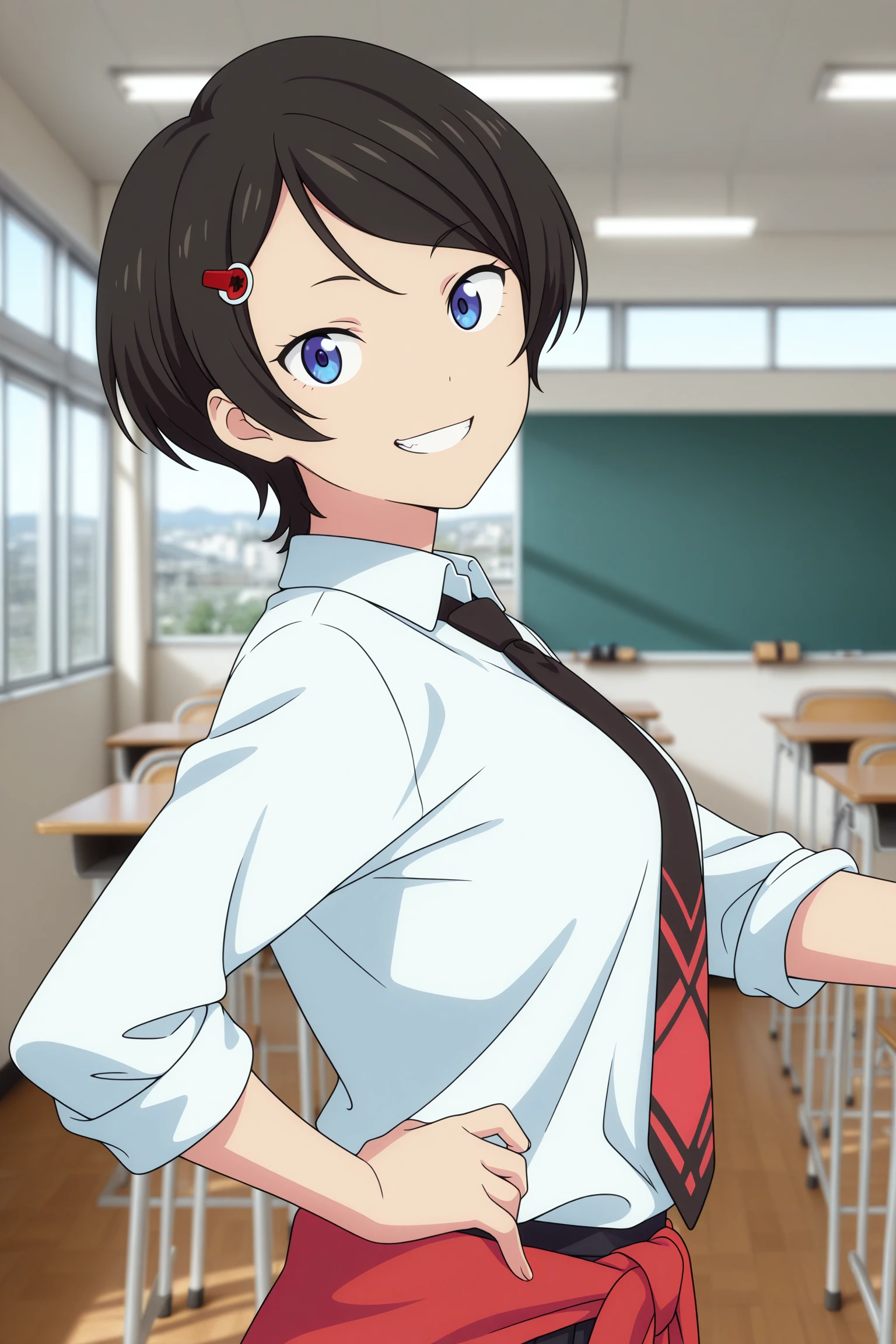 namiko, short hair, black hair, parted bangs, hairclip, blue eyes, sleeves rolled up, white shirt, collared shirt, black necktie, red necktie, red jacket, track jacket, jacket around waist, black skirt, pleated skirt, black socks, striped socks, ankle socks, white footwear, sneakers