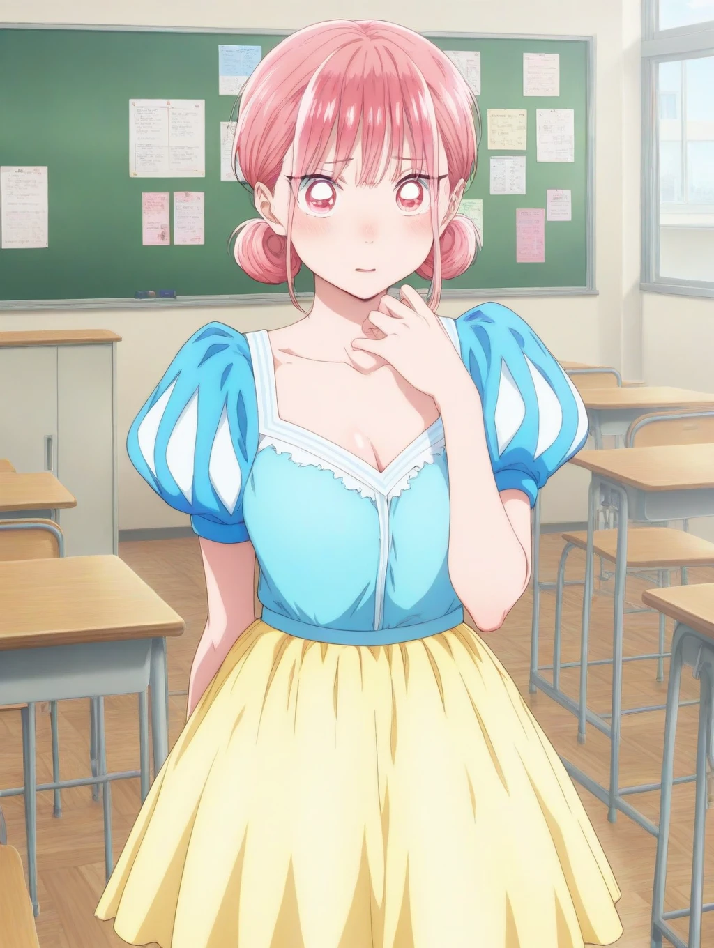 白雪公主服:blue dress , yellow skirt, , puffy short sleeves