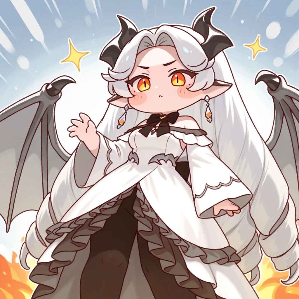 tag : 1girl, medium breasts, dragon wings, black_horns, white dress, earrings, very long hair, black pantyhose, pointy_ears, long sleeves, black bowtie, white hair, orange_eyes, off-shoulder dress, high-low skirt, wide sleeves, quad drills,, chibi, blush stickers