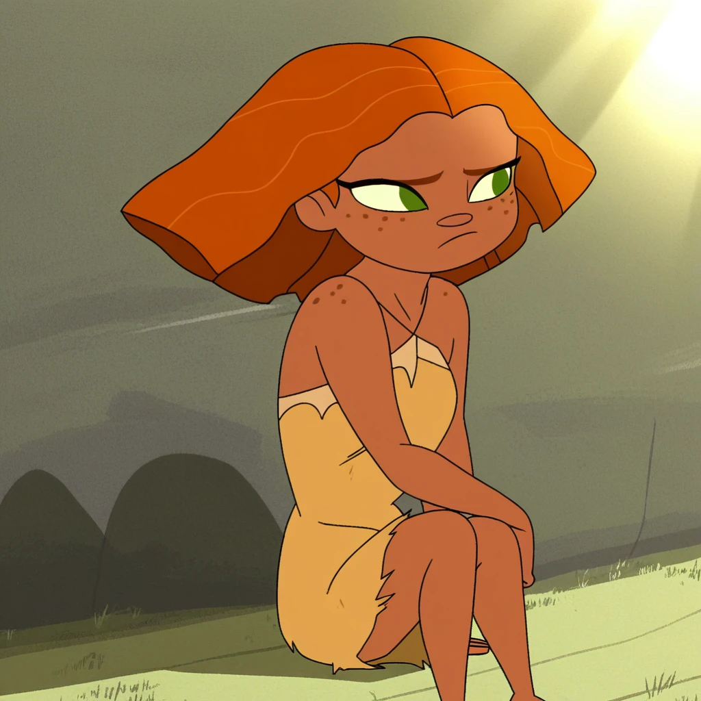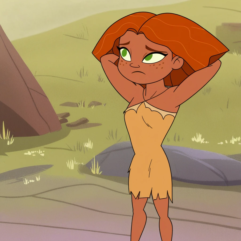 eep_crood, orange hair, dark skin, green eyes, freckles, primitive dress