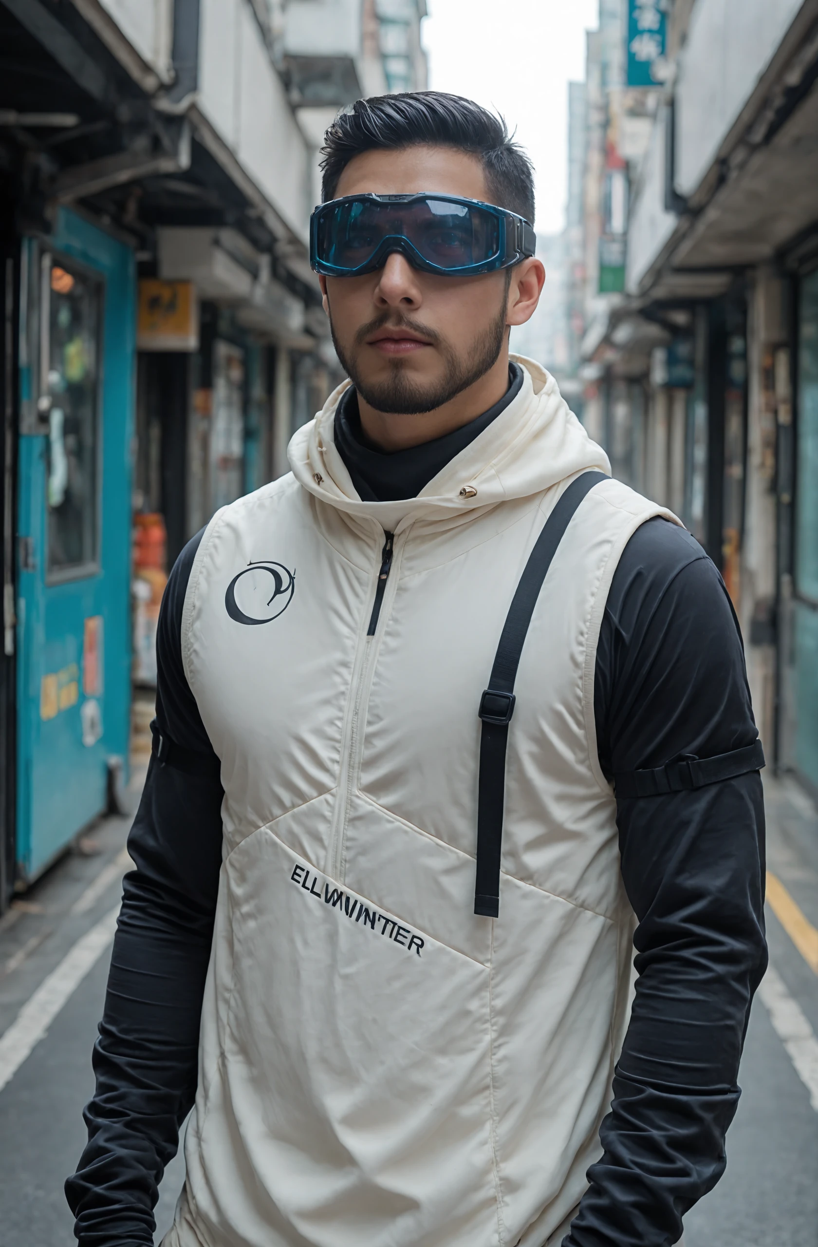 cyborg, black short hair, beard, goggles,