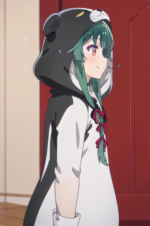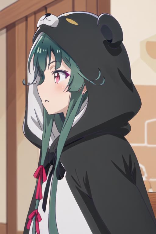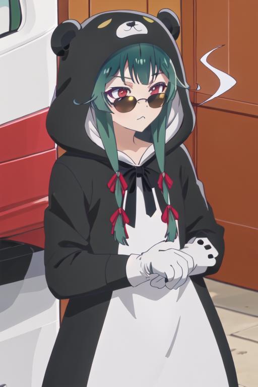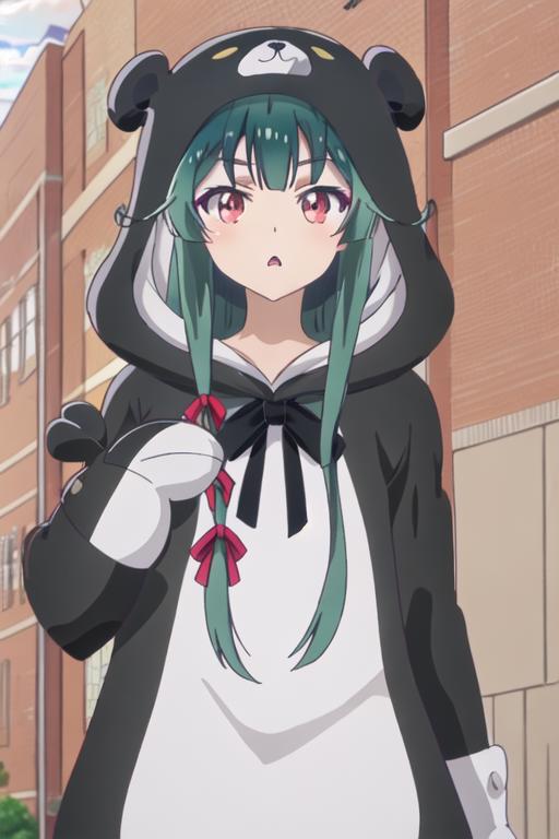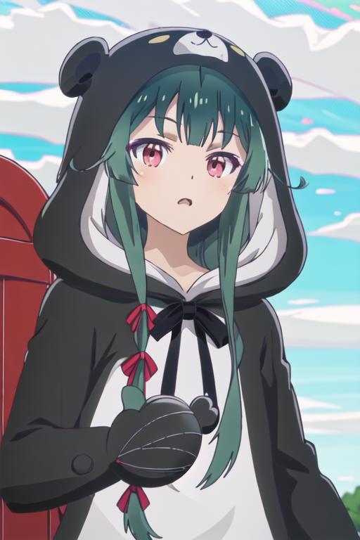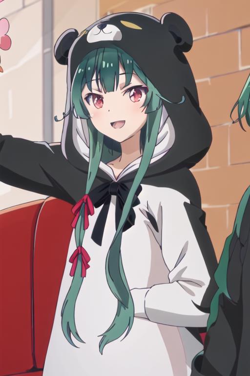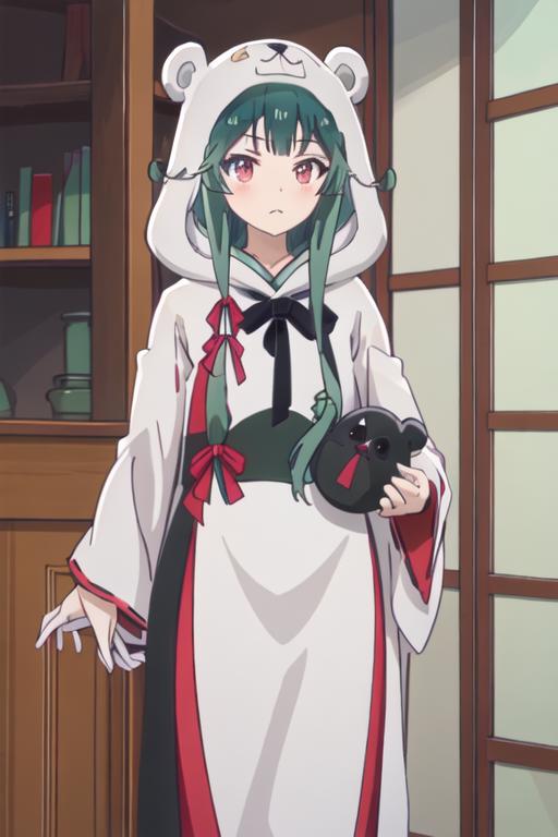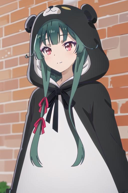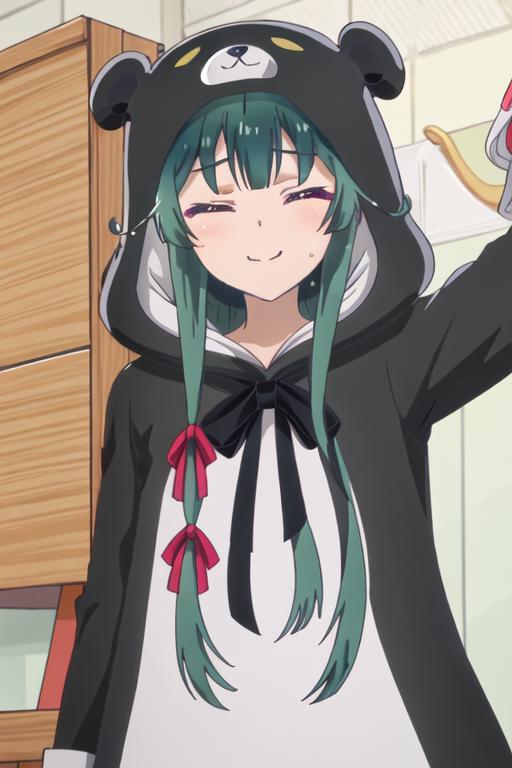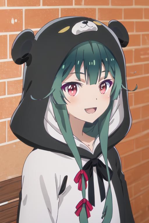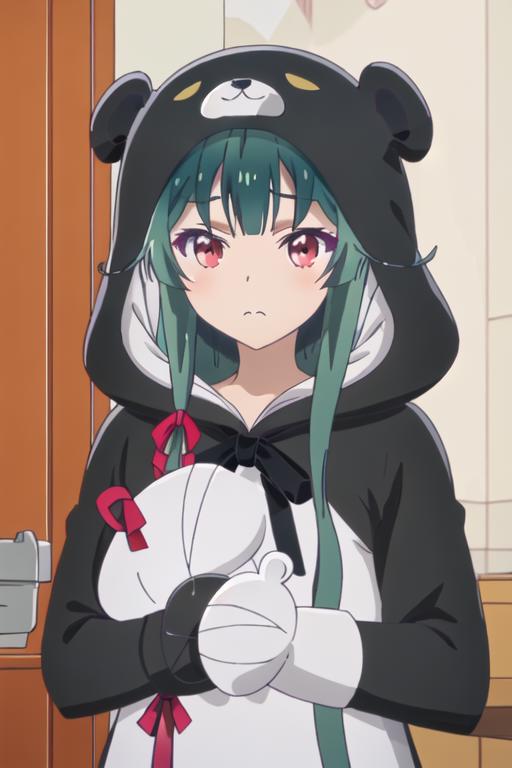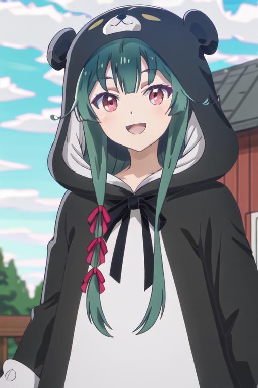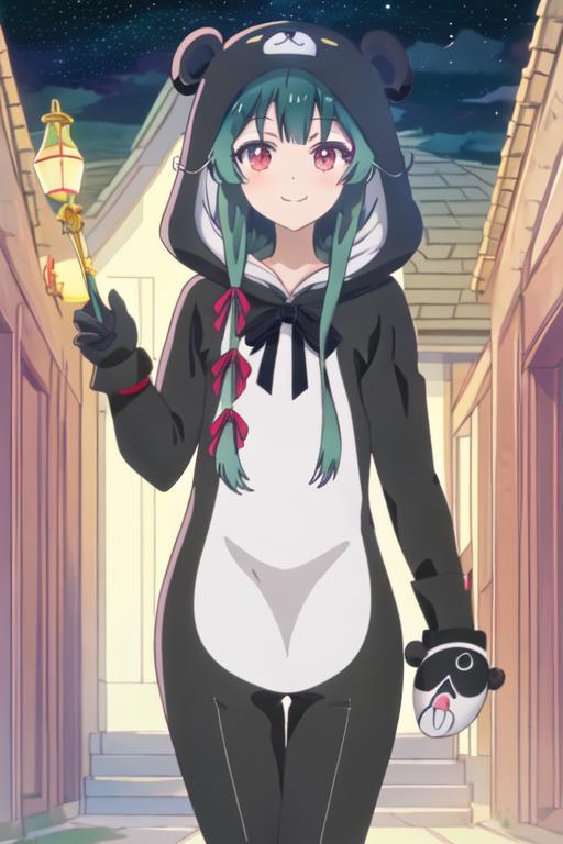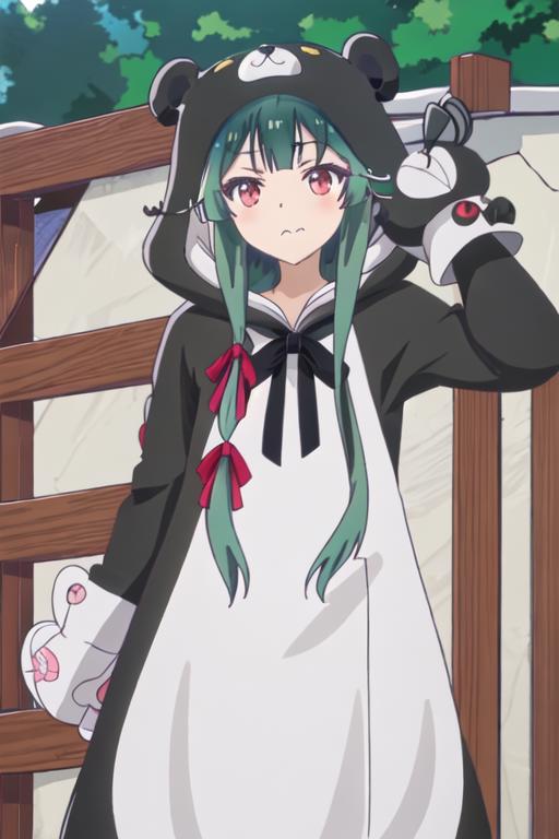 The trigger word is yuna_kumakumakumabear, and the recommended tags are best quality, masterpiece, highres, solo, {yuna_kumakumakumabear:1.15}, green_hair, bangs, long_hair, red_eyes, cosplay, kigurumi, blush, ribbon, closed_mouth, bear_ears, hair_ribbon.