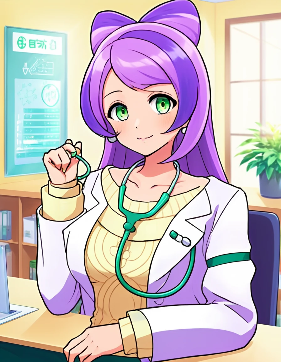 Some of the Keywords: miriam, long hair, purple hair, jewelry, green eyes, earrings, coat, looking at viewer, sweater, open coat, skirt, white coat, open clothes, multicolored hair