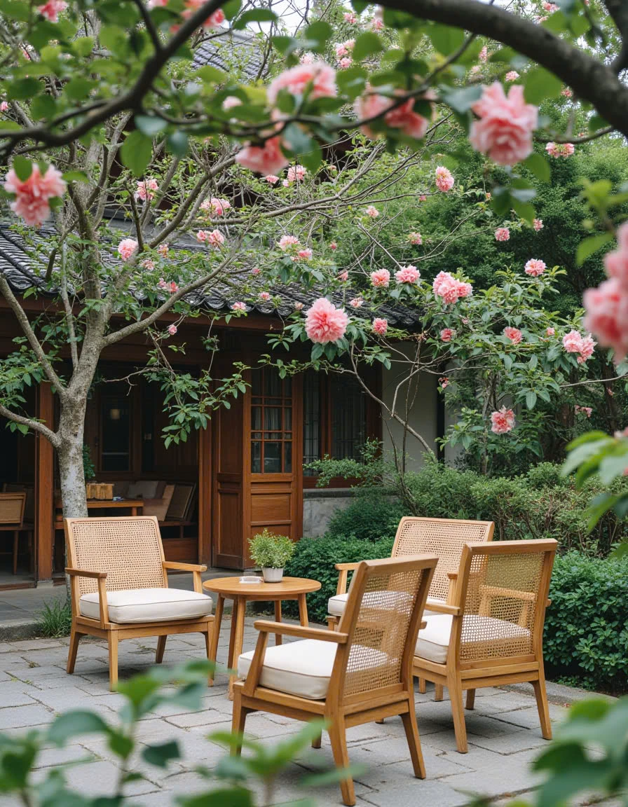 A photo of a peaceful garden with four cream-colored wicker chairs arranged around a small round wooden table. The backdrop is a wooden building with large windows and a door, creating a cozy atmosphere. Bright pink flowers and lush greenery surround the seating area, adding to the peaceful atmosphere. Sunlight filters through the leaves, adding warmth to the scene.