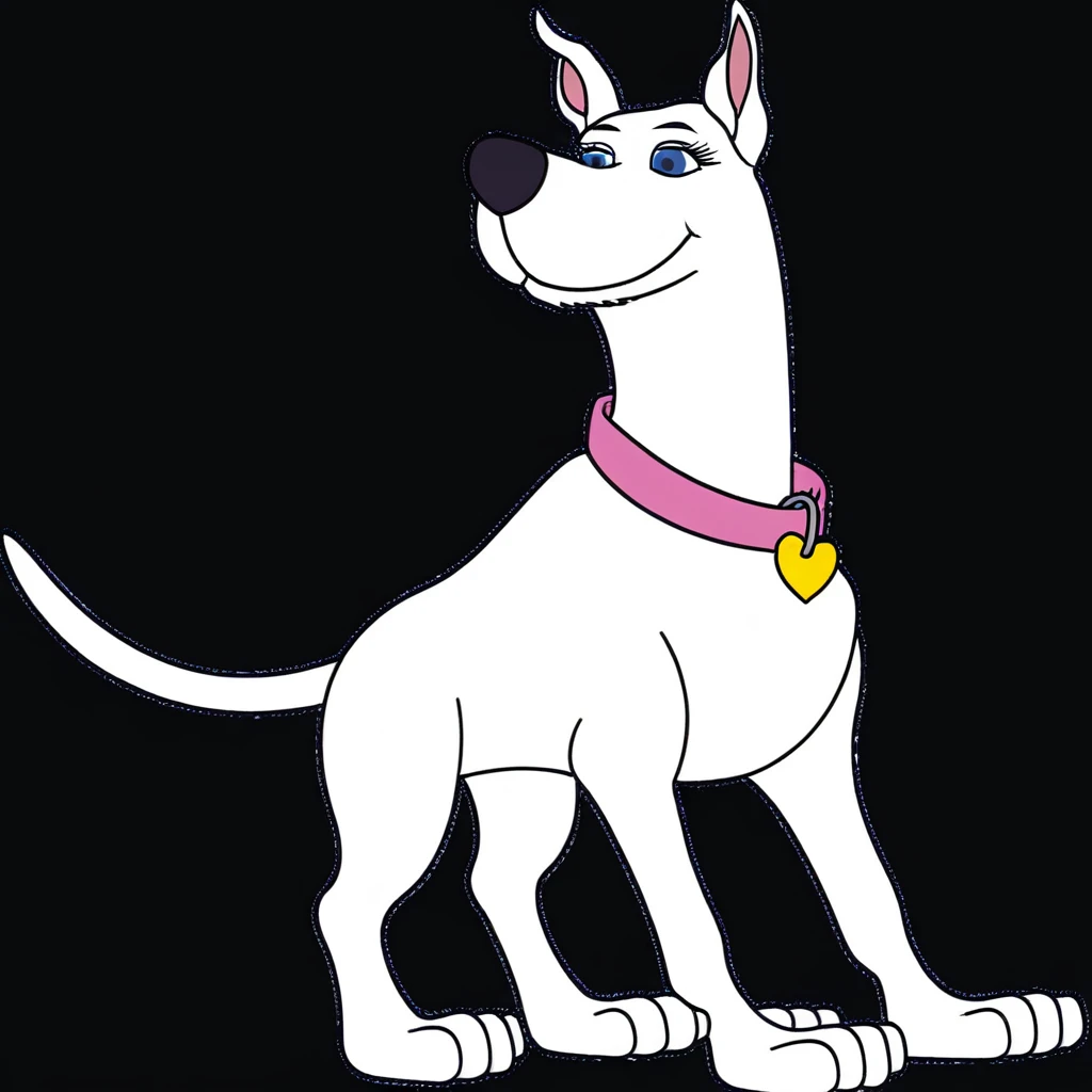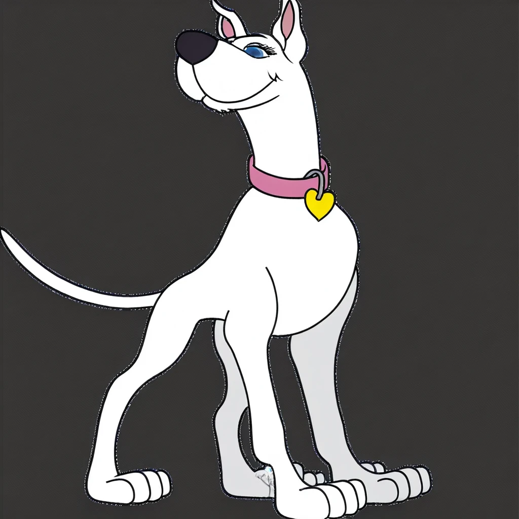 Scooby-dee ,female, solo, dog, great Dane, white fur, blue eyes, standing, smile, furry anthro, red tunic, dark pink long sleeves, brown belt, blue pants, red boots, medieval boots, full body, outdoors, castle, daytime