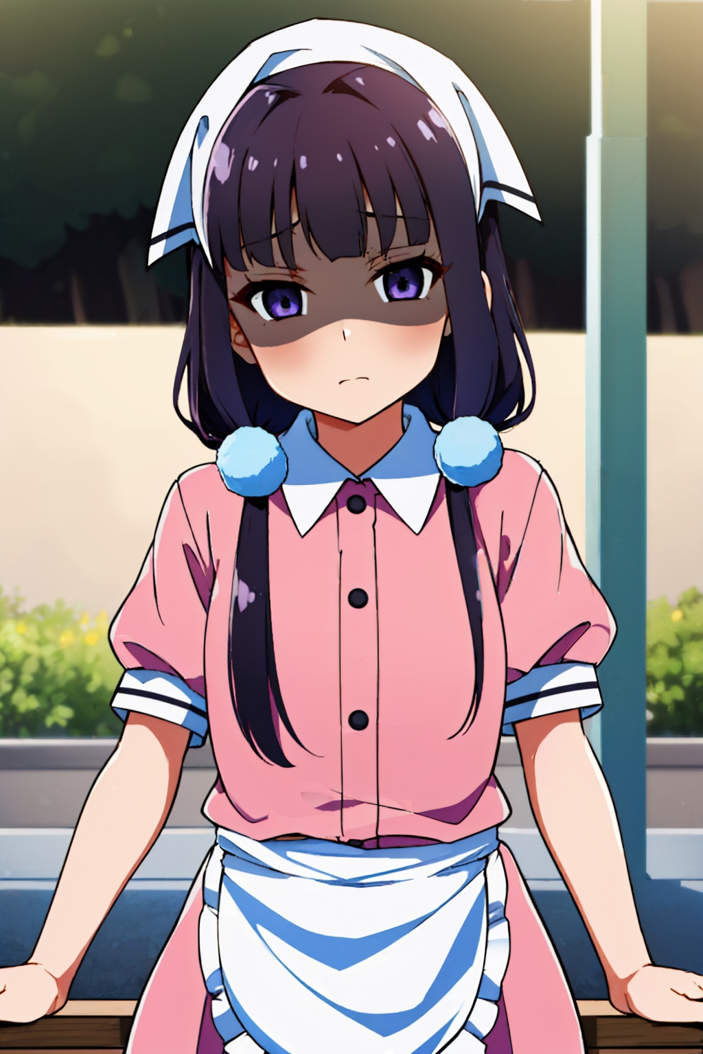 frills, white gloves, pink uniform, puffy short sleeves, waist apron, white apron, pink shirt, frilled apron, head scarf