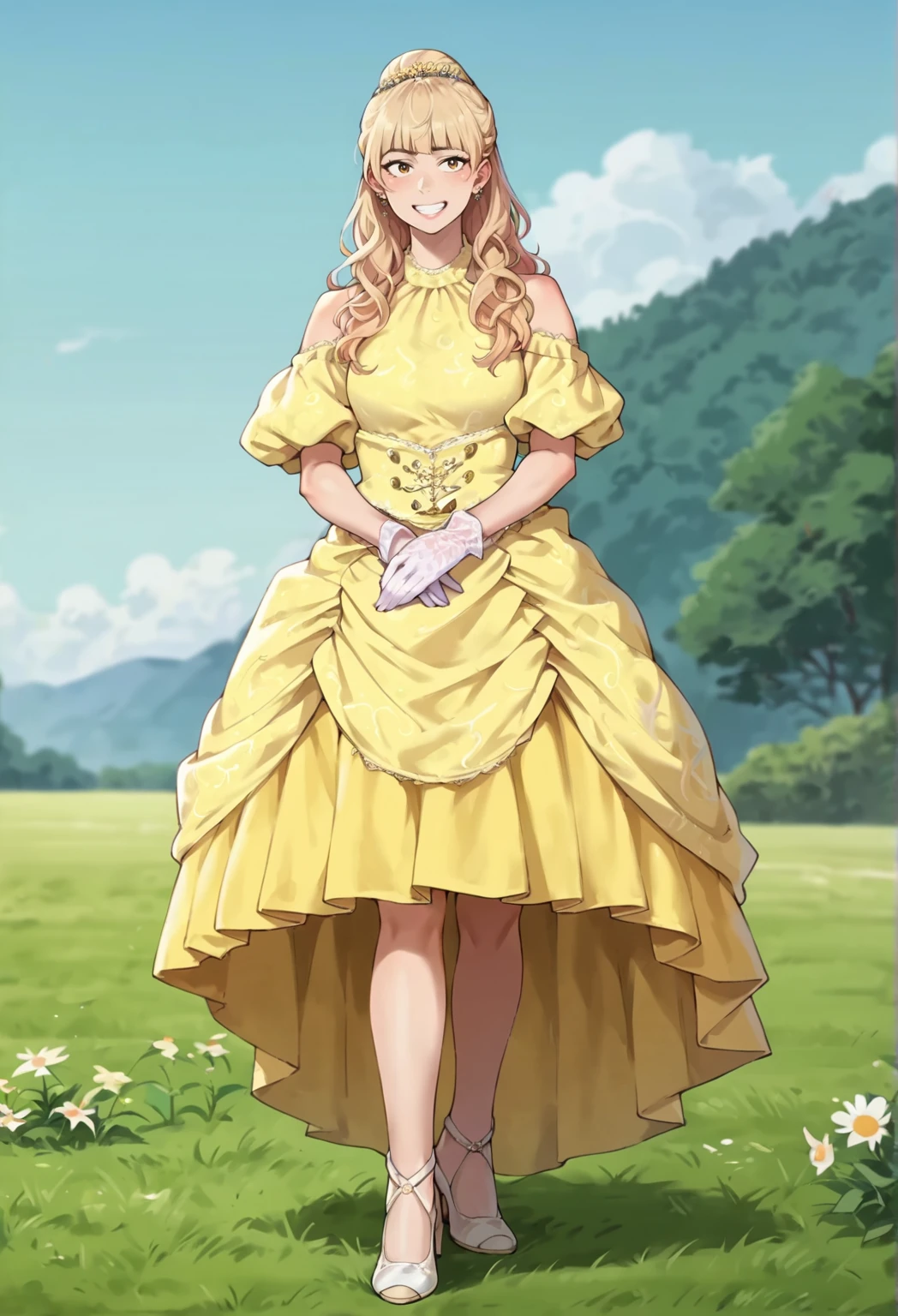 Recommended prompt: hymenoran, brown eyes, blonde hair, curly hair, yellow dress, white gloves