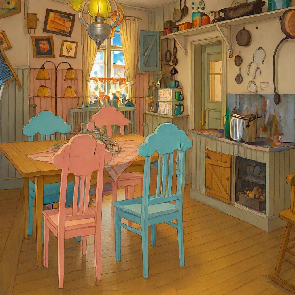 interior, colorful playful kitchen, wooden floors, pastel furniture, cloud-shaped chairs, cozy dining table, vintage stove, hanging kitchenware, warm natural light, whimsical atmosphere
