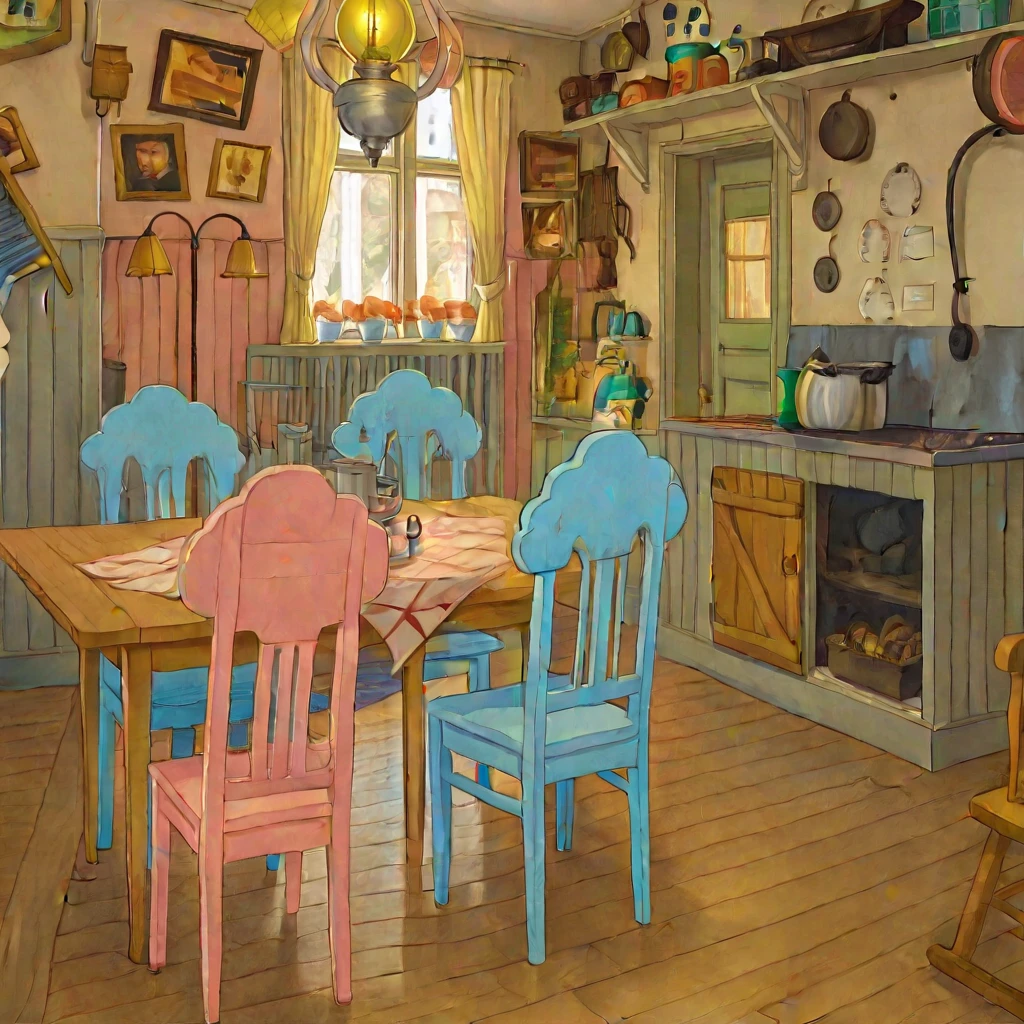 pippi longstocking's home interior, colorful playful kitchen, wooden floors, pastel furniture, cloud-shaped chairs, cozy dining table, vintage stove, hanging kitchenware, warm natural light, whimsical atmosphere