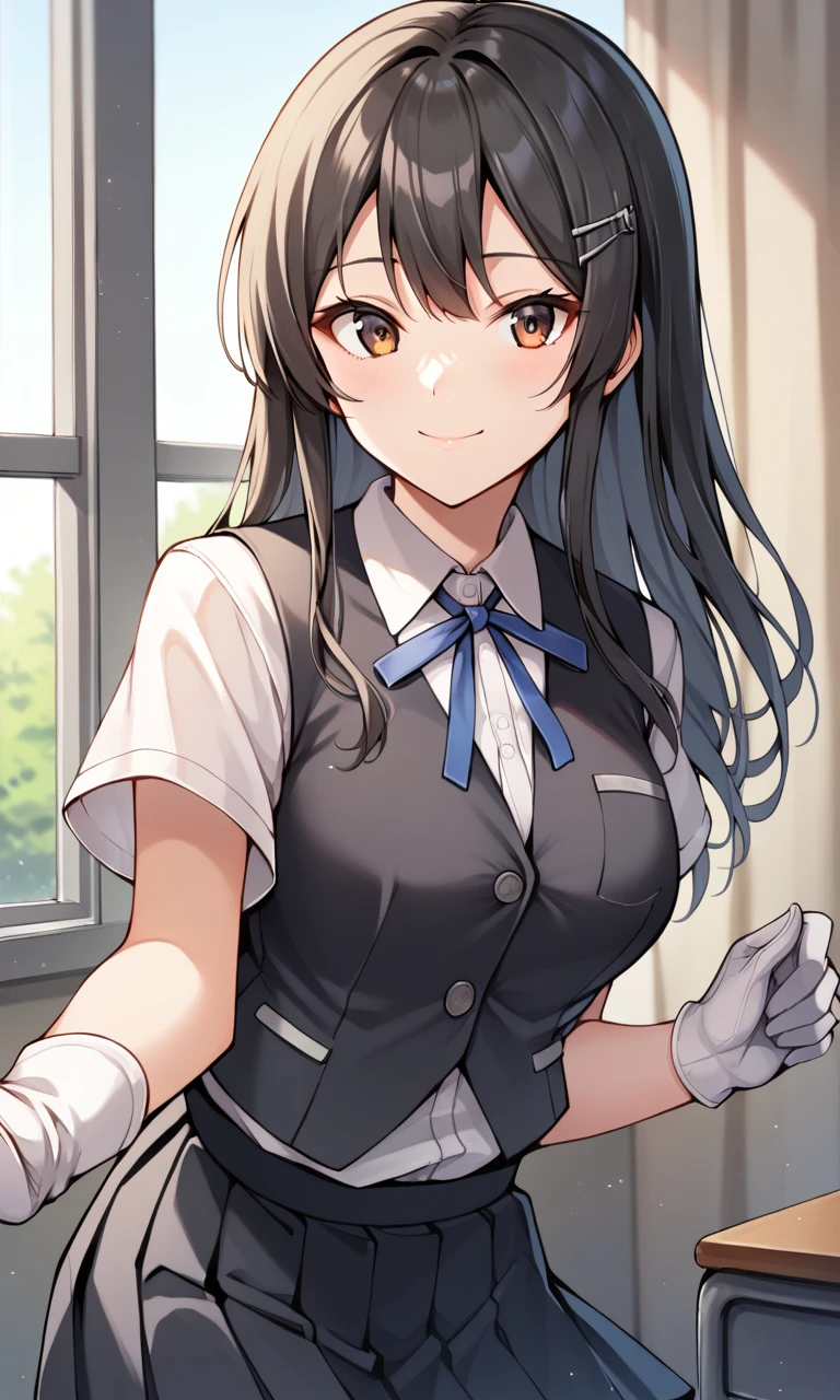 oyashioKC,black hair, long hair,school uniform, white shirt, short sleeves, pleated skirt, hairclip, collared shirt, white gloves, black skirt, neck ribbon, blue ribbon, black vest