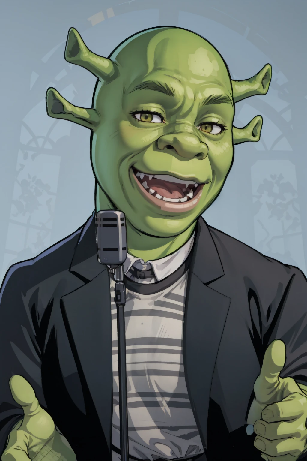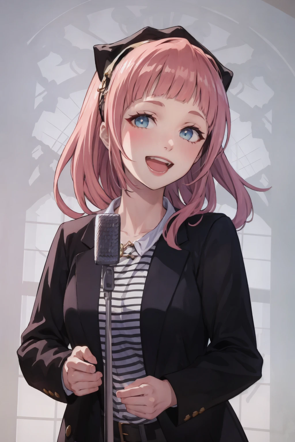 smile, looking at viewer, microphone stand, upper body, black jacket, striped shirt, open mouth