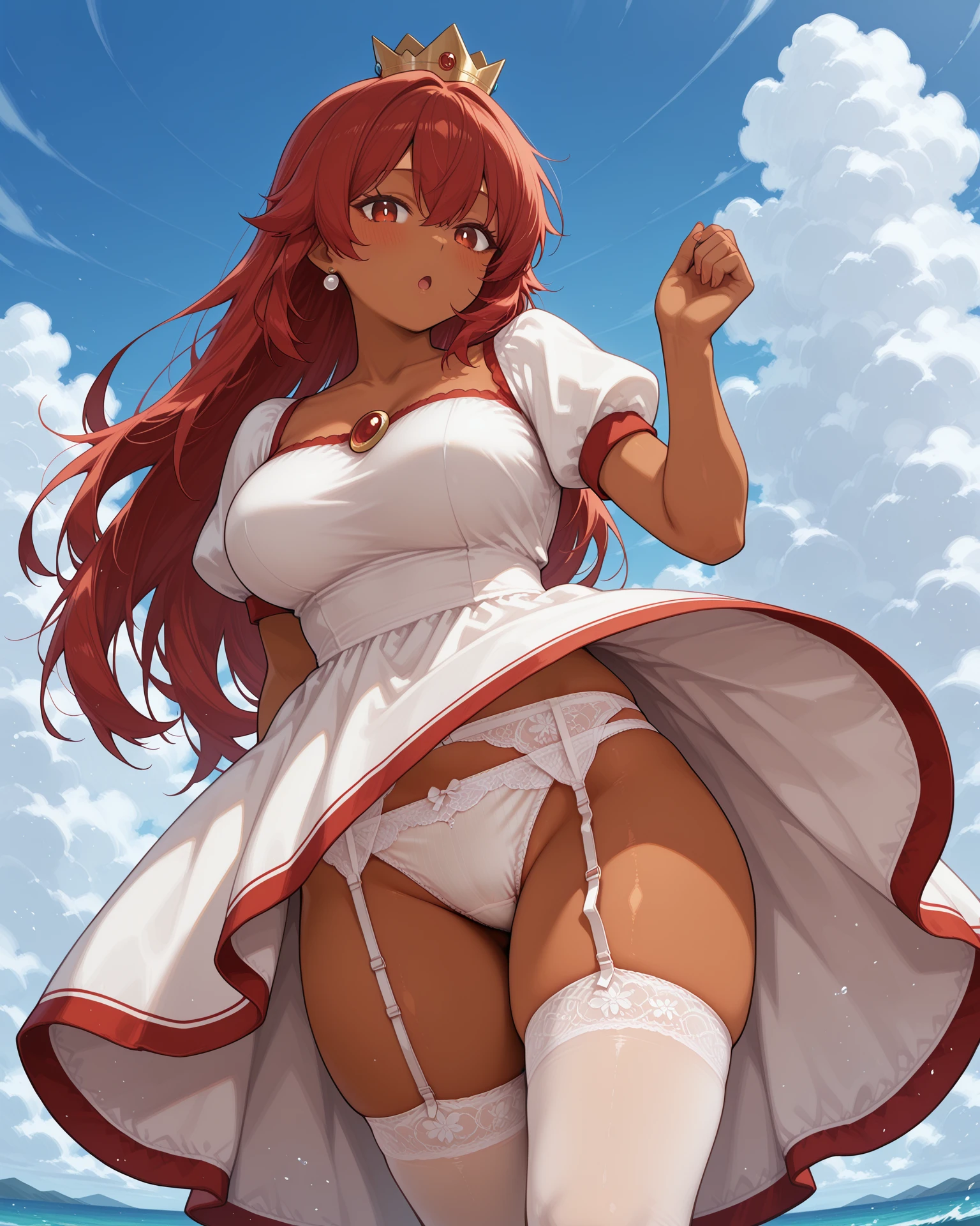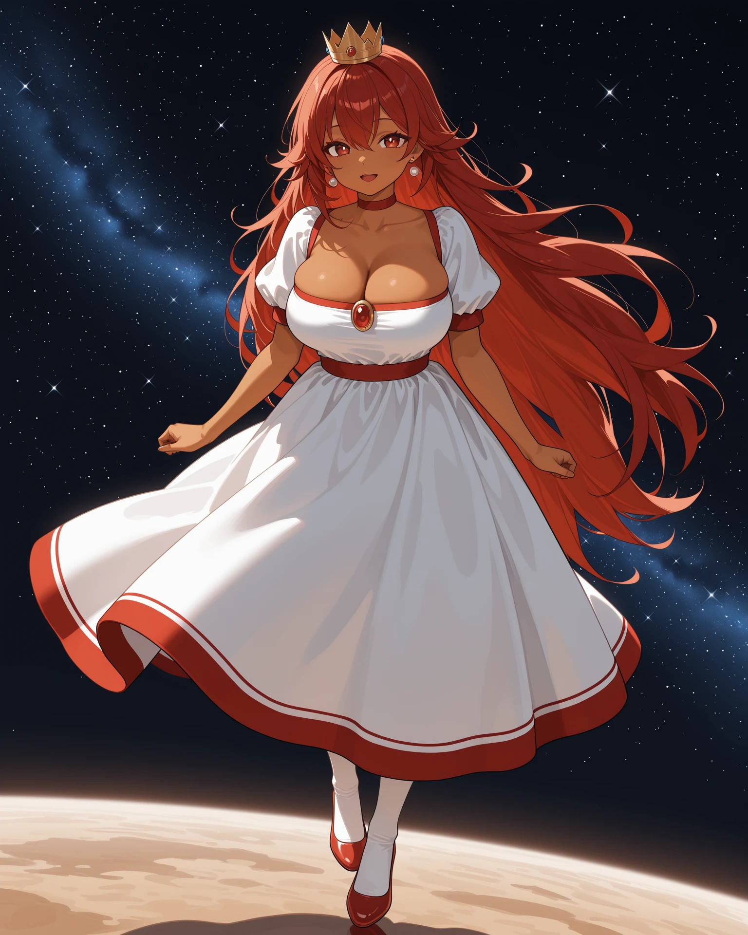 NESPeach, red eyes, white pupils, dark skin, red hair, very long hair, hair between eyes, mini crown, white earrings, collarbone, cleavage, large breasts, white dress, red trim, red brooch, gemstone, puffy short sleeves, long skirt, frilled choker, white elbow gloves, red footwear,