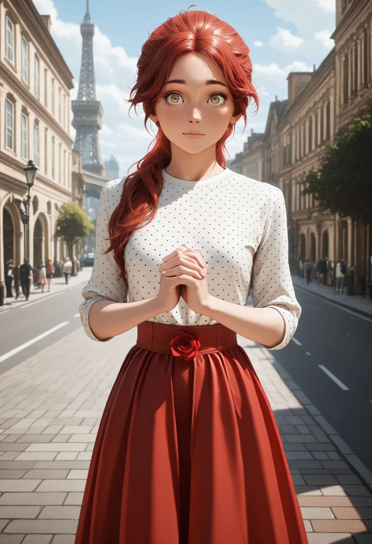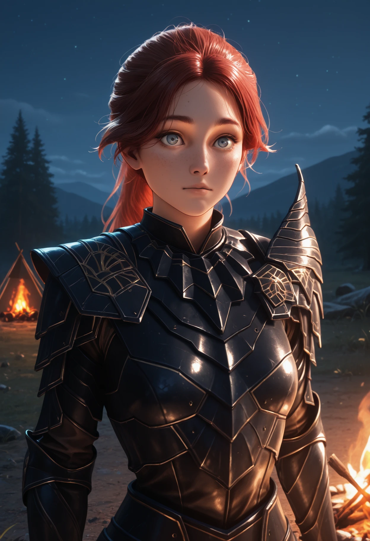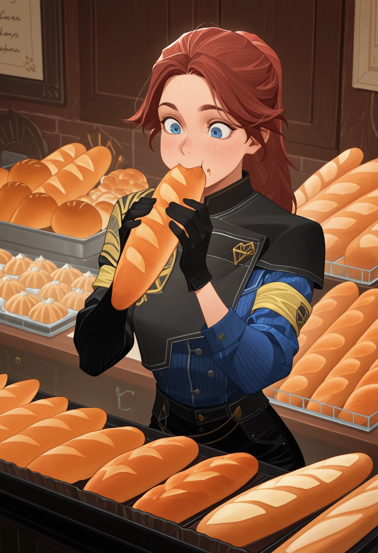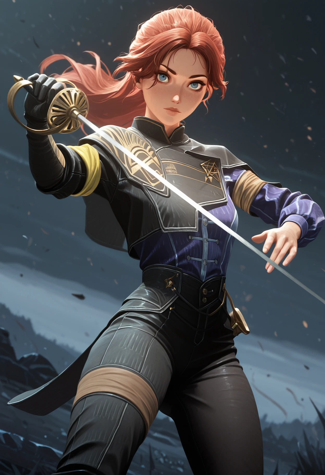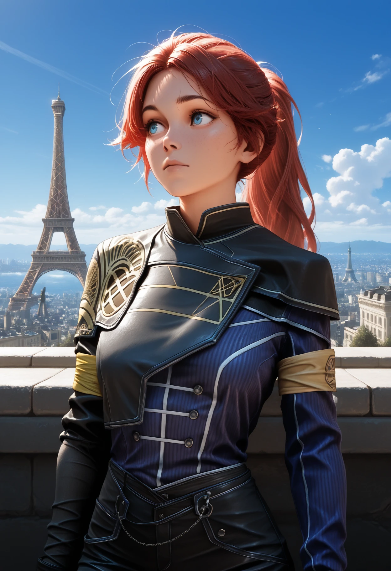 The outfit is "asymmetrical shirt, gloves, black pants, armband, boots"
