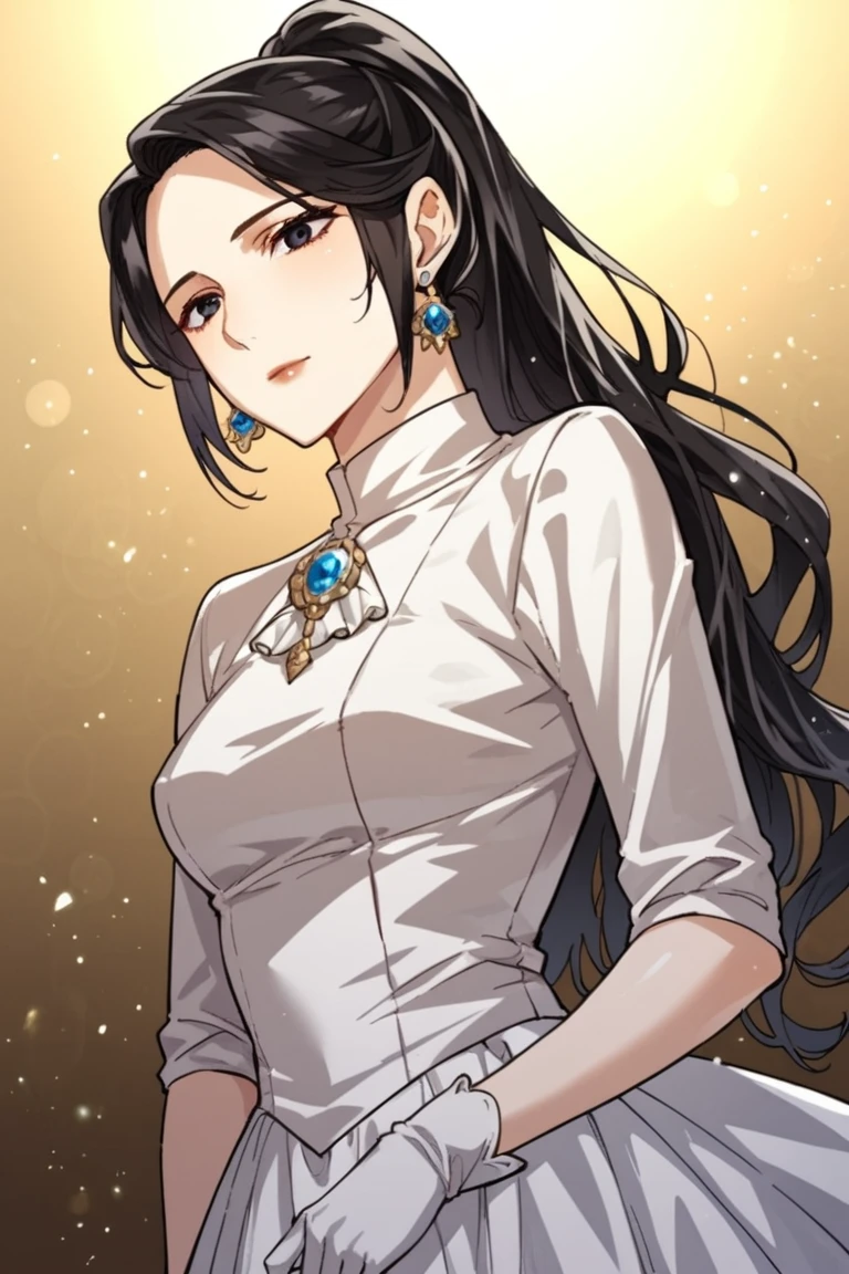 long hair, black hair, gloves, ponytail, black eyes, dress, jewelry, earrings, skirt