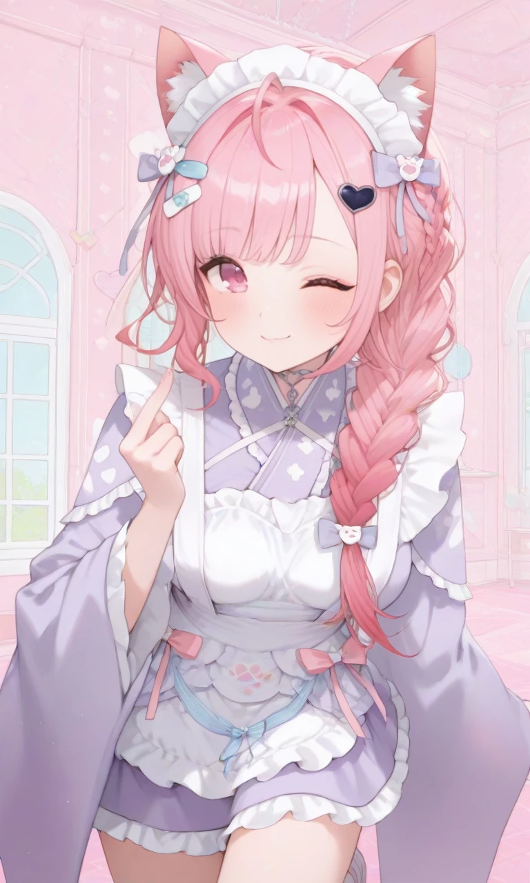 • 🎀 sakuna second, cat ears, medium hair, wa maid, white apron, hair ornament, maid headdress, maid apron, purple kimono