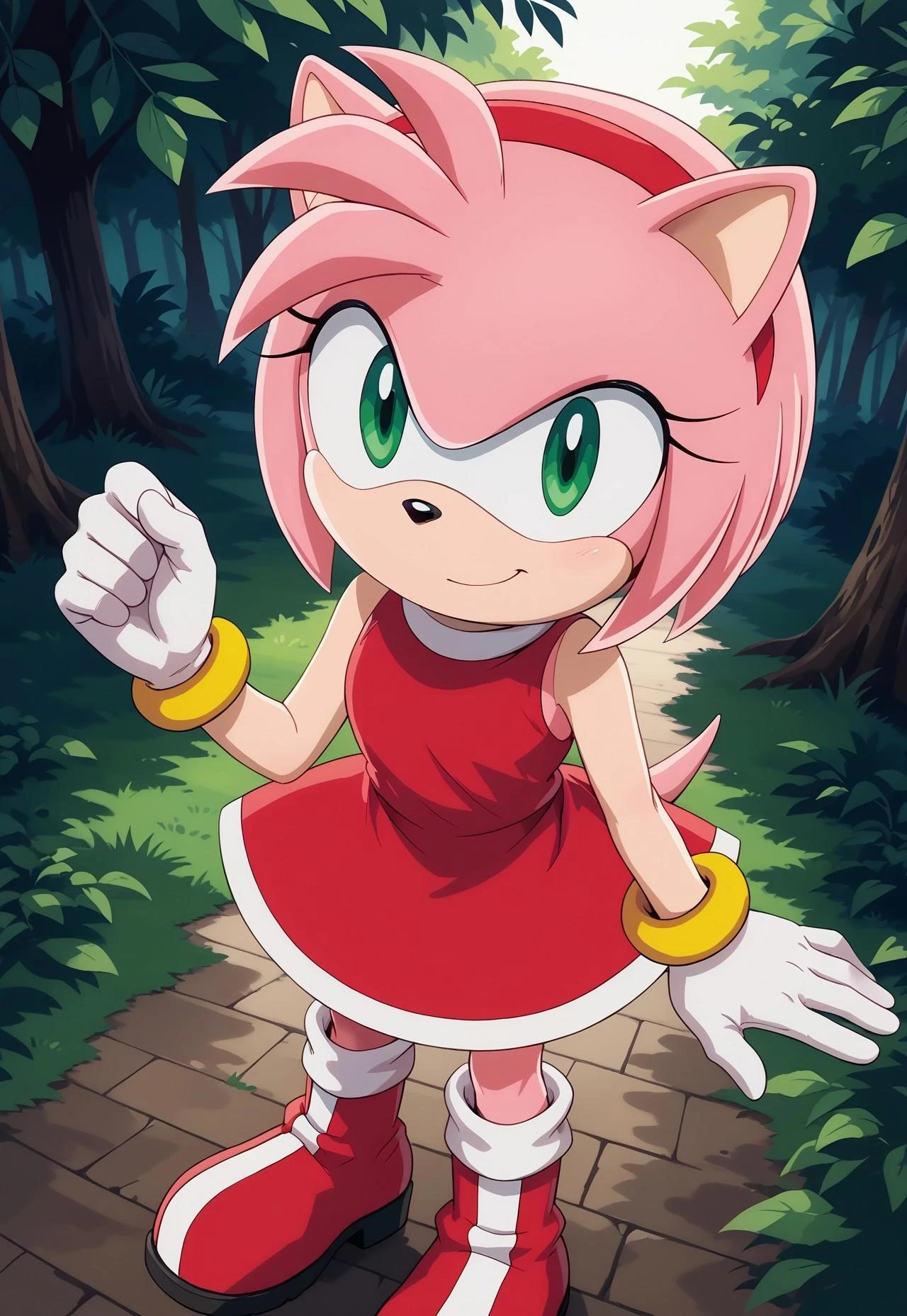 AmyRose, furry female, solo, pink fur, red hairband, green eyes, red sleeveless dress, yellow bracelet, white gloves, short tail, white socks, boots
