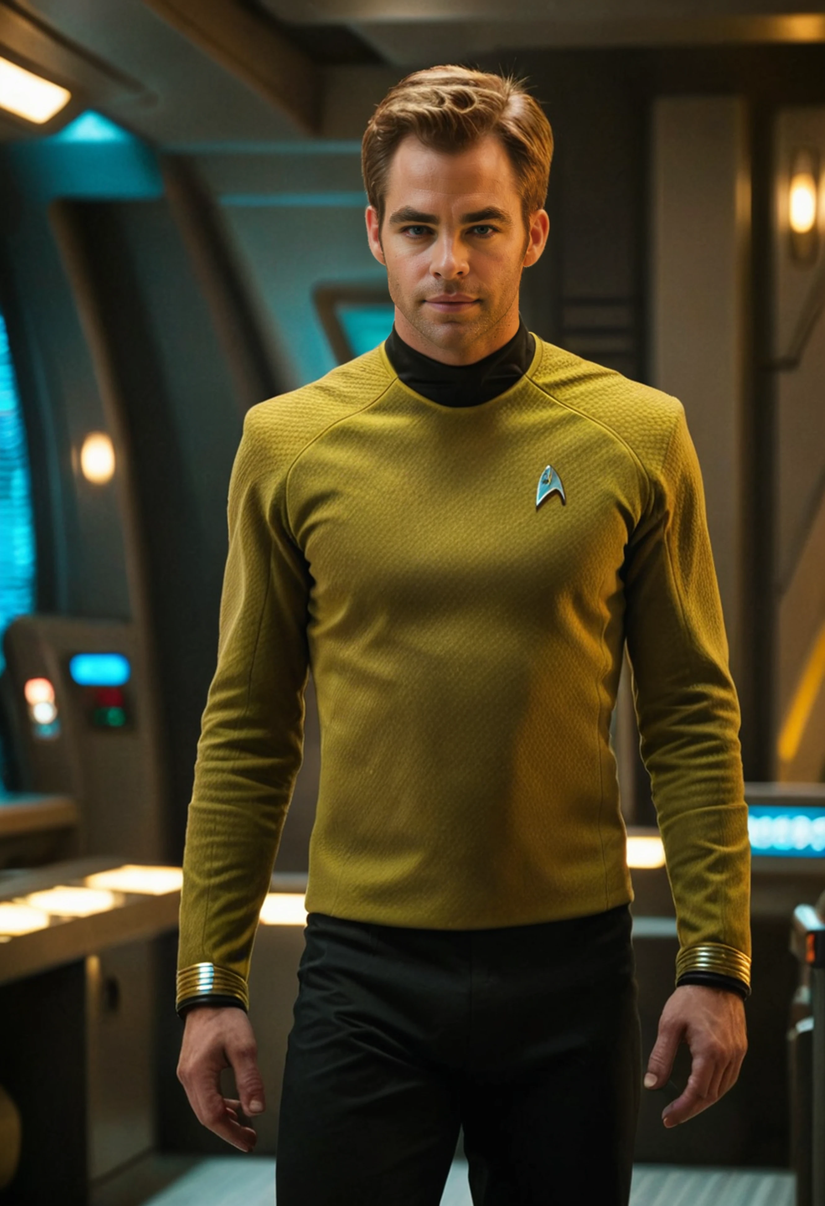 For his "Star Trek" uniform, use "yellow starfleet uniform" and maybe "black pants" if needed. The images may be a mix of the first two and "Beyond" variants of the gold uniform.