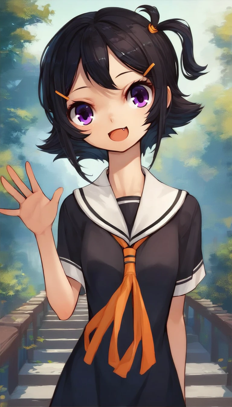 HeJiaSG1, human, female, black hair, side ponytail, short hair, orange hair tie, orange hairpins, purple eyes, cute fang, small breastsILL: fang
