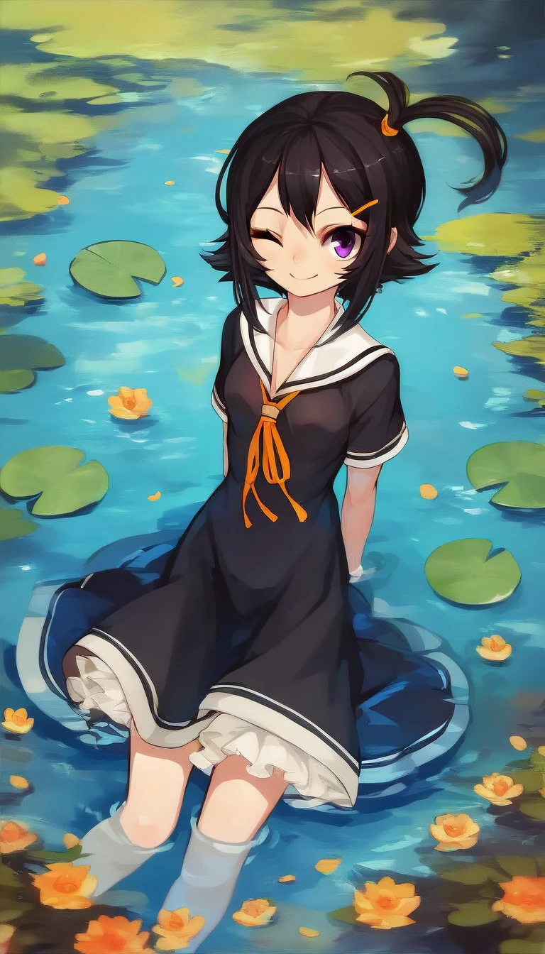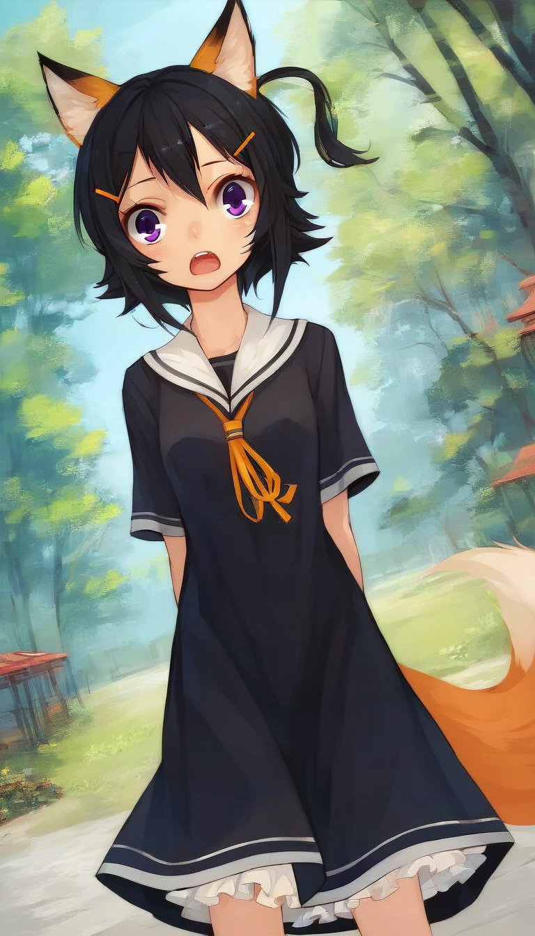 HeJiaSG1, black hair, side ponytail, short hair, orange hair tie, orange hairpins, purple eyes, fang, small breastsILL: fang