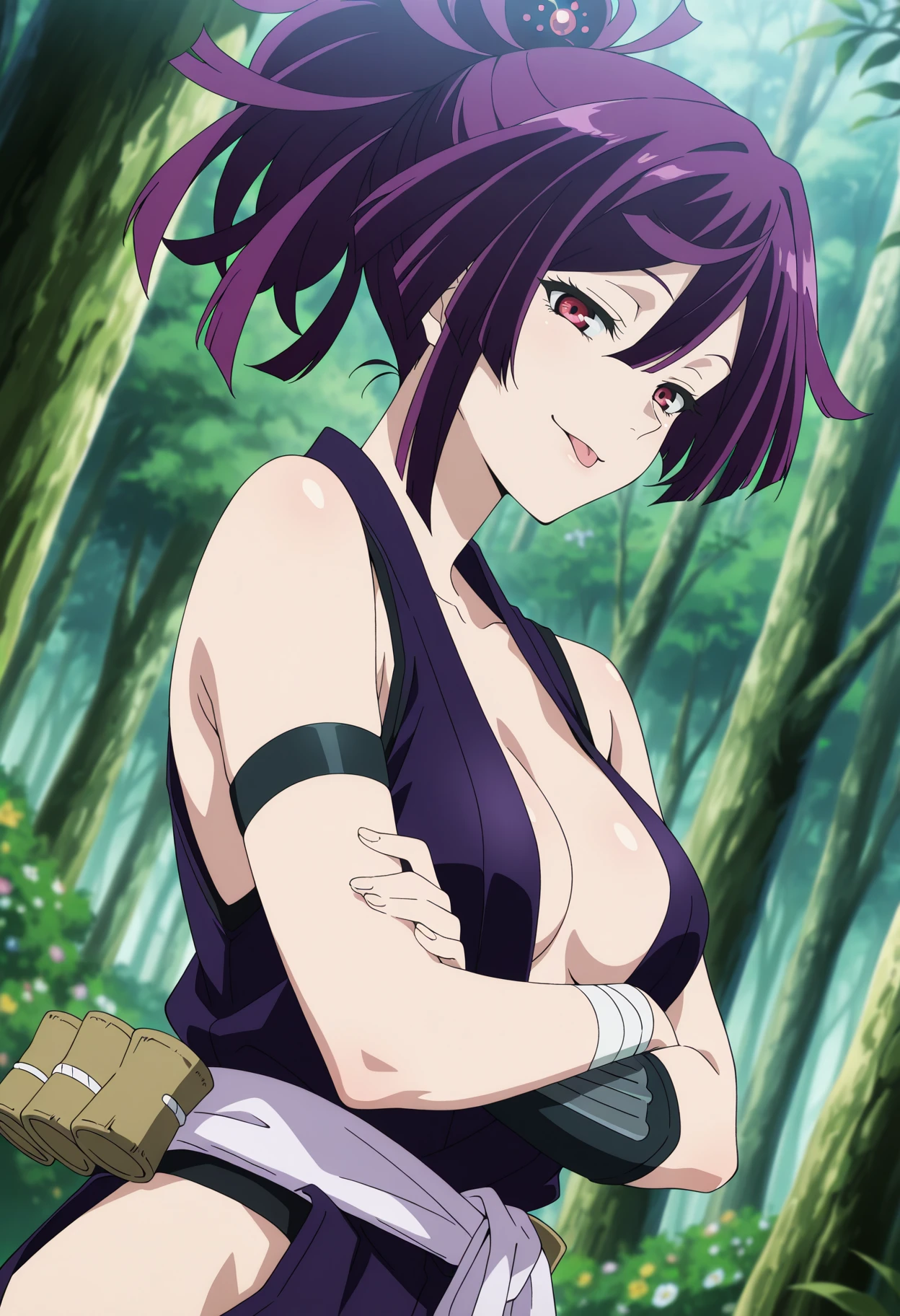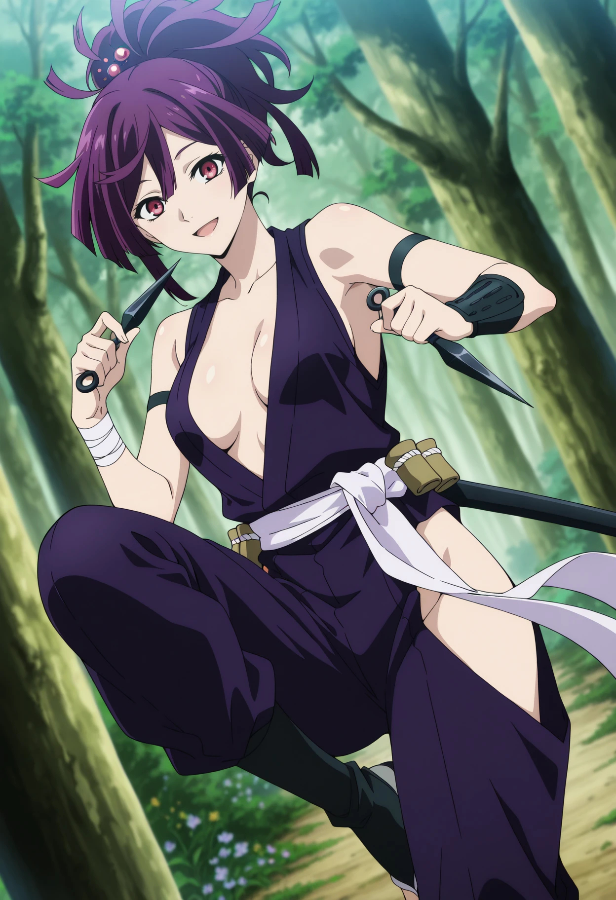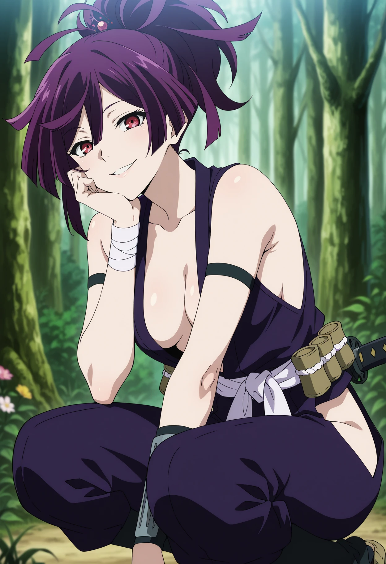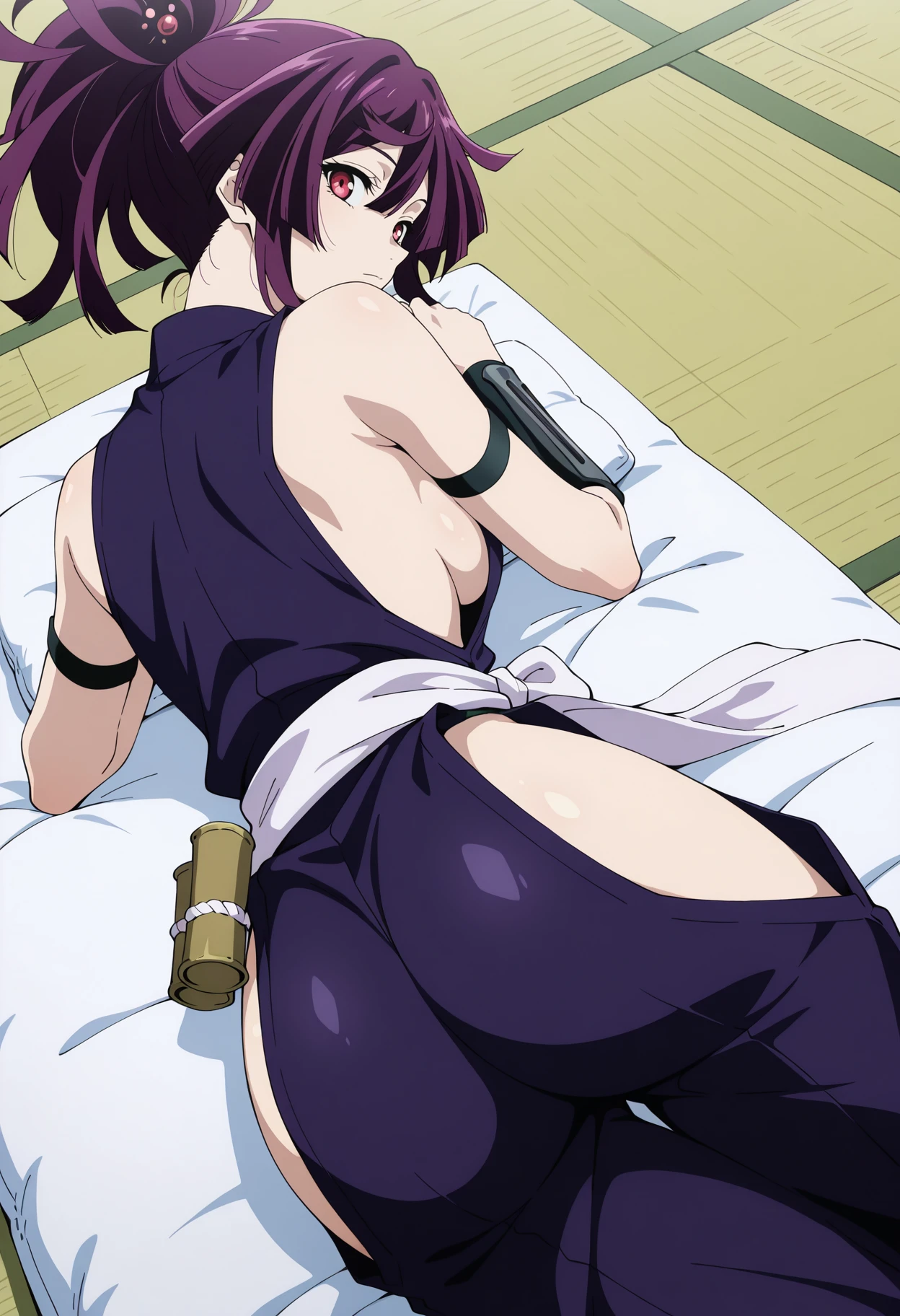 Base: yuzuriha_j, 1girl, anime coloring, retro artstyle, solo, short hair, ponytail, topknot, hairpin, purple hair, hair between eyes, purple eyes, yuzu purple sleeveless kimono, center opening, medium breasts, white sash, hip vent, black armband, single wrist guards, bandage wrist, bare shoulders, short sheathed katana,