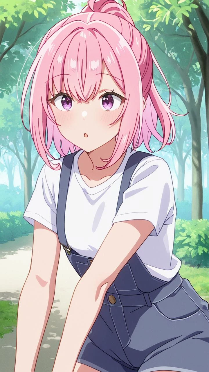 HarunaAmaori, purple eyes, pink hair, medium hair, ponytail, hair bangs, hair between eyes, small breasts