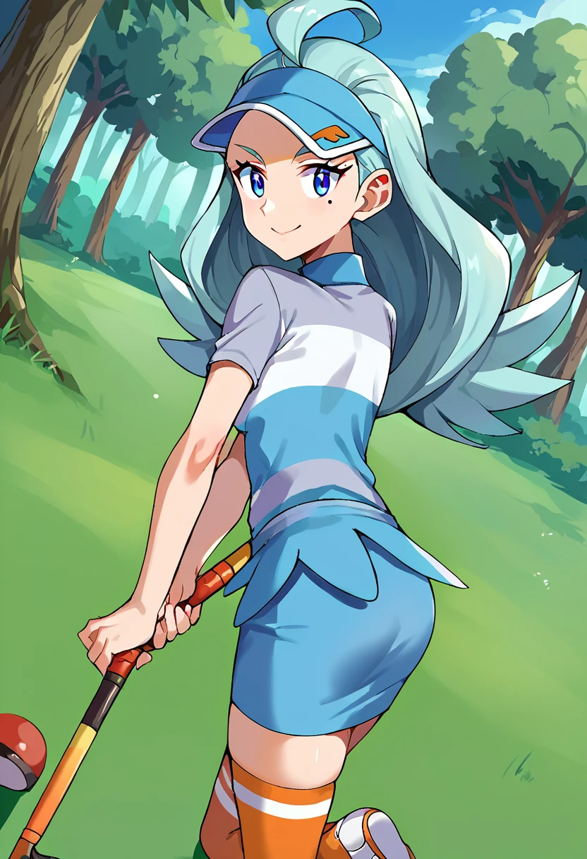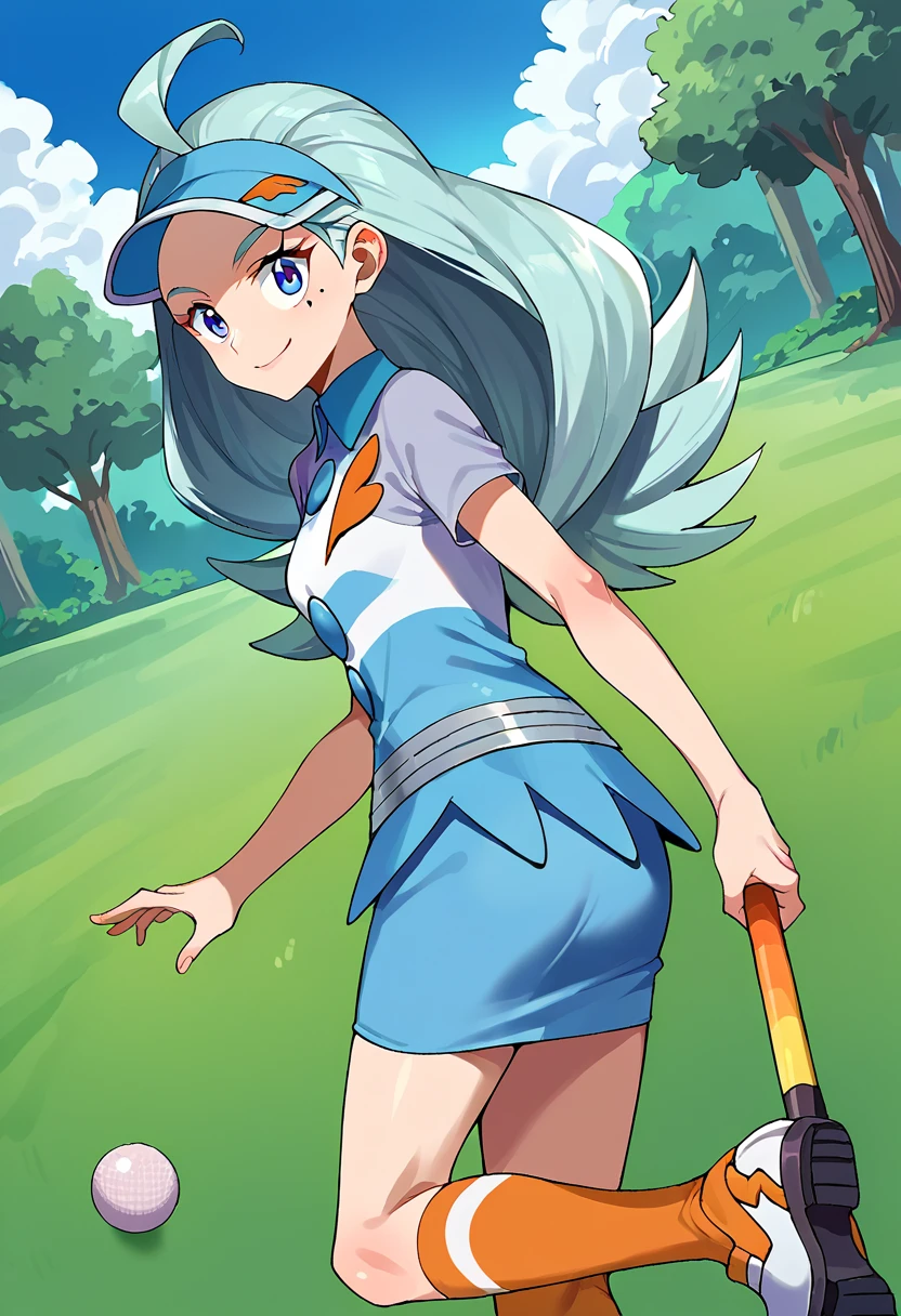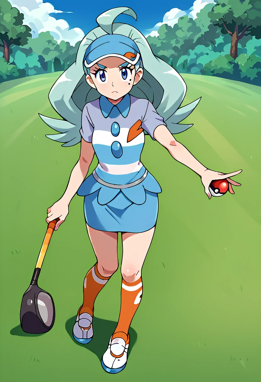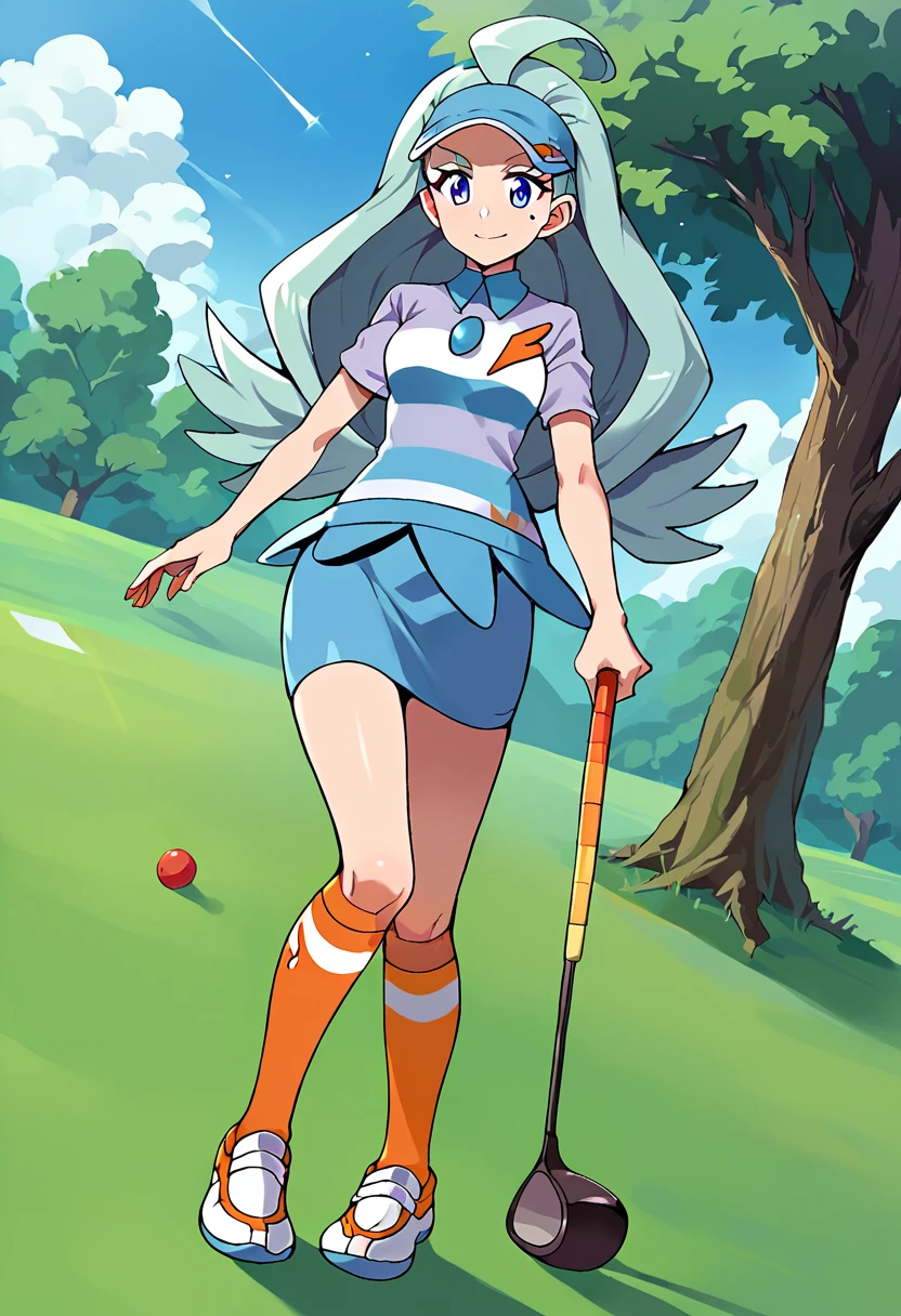 kahil1,1girl,solo,light blue hair,long hair,flipped hair,ahoge,mole under eye,blue eyes,visor cap,blue headwear,striped shirt,striped clothes,collared shirt,short sleeves,buttons,blue skirt,pencil skirt,miniskirt,kneehighs,orange socks,shoes,golf club,