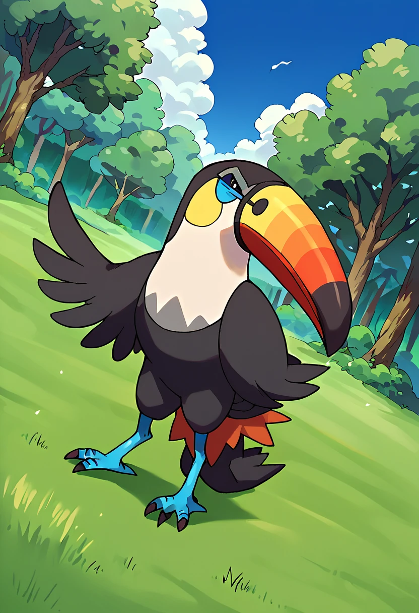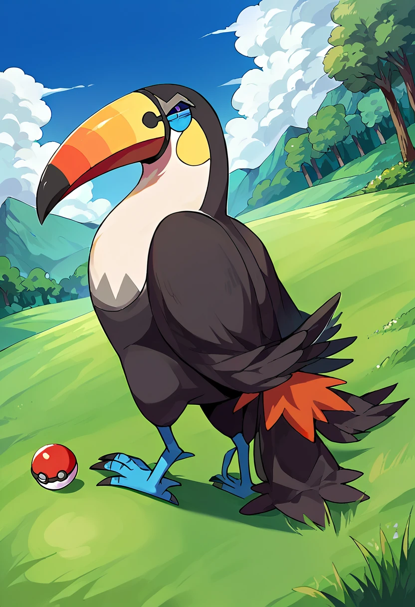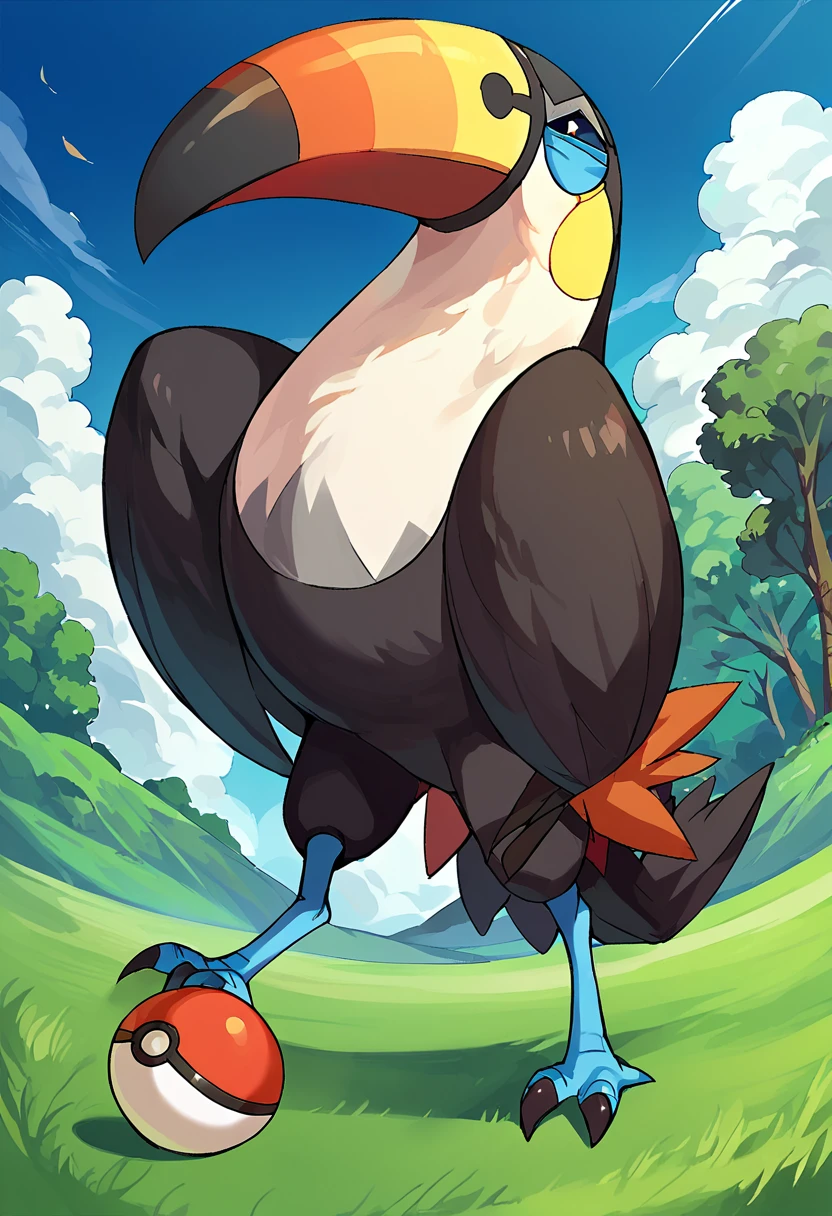 tou_cannon,solo,no humans,pokemon (creature),bird,beak,talons,wings,bird tail,feathers,black eyes,colored sclera,blue sclera,closed mouth,
