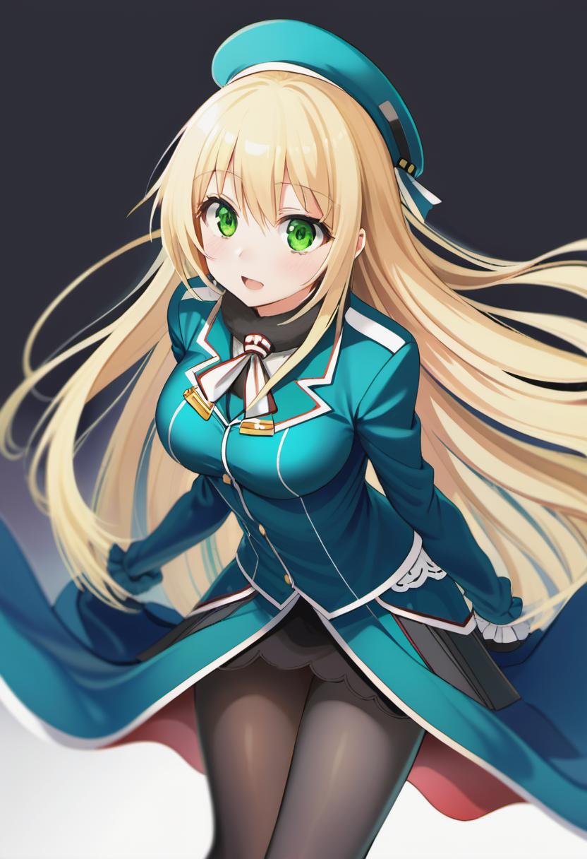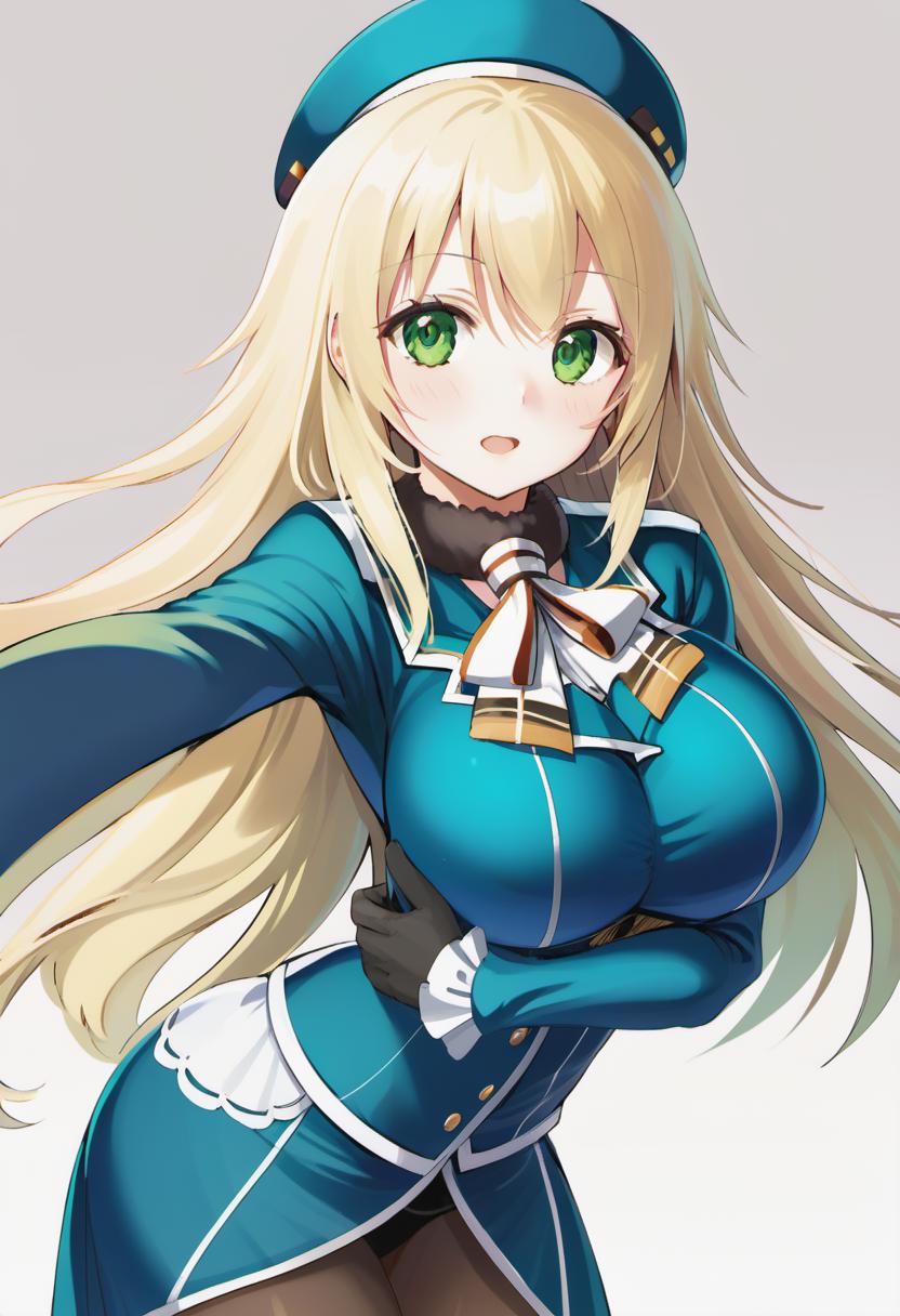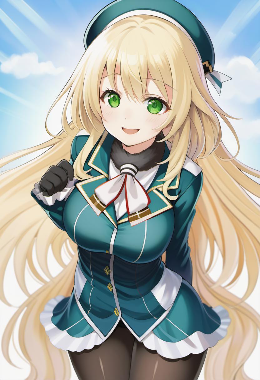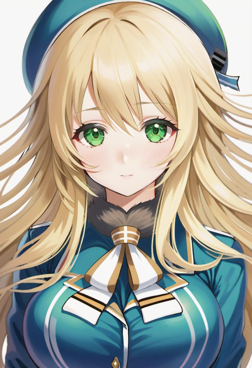 Additional words: blonde, green eyes (or bluish green eyes), beret
