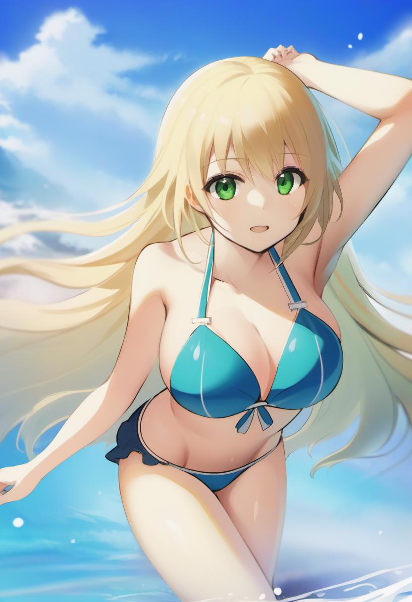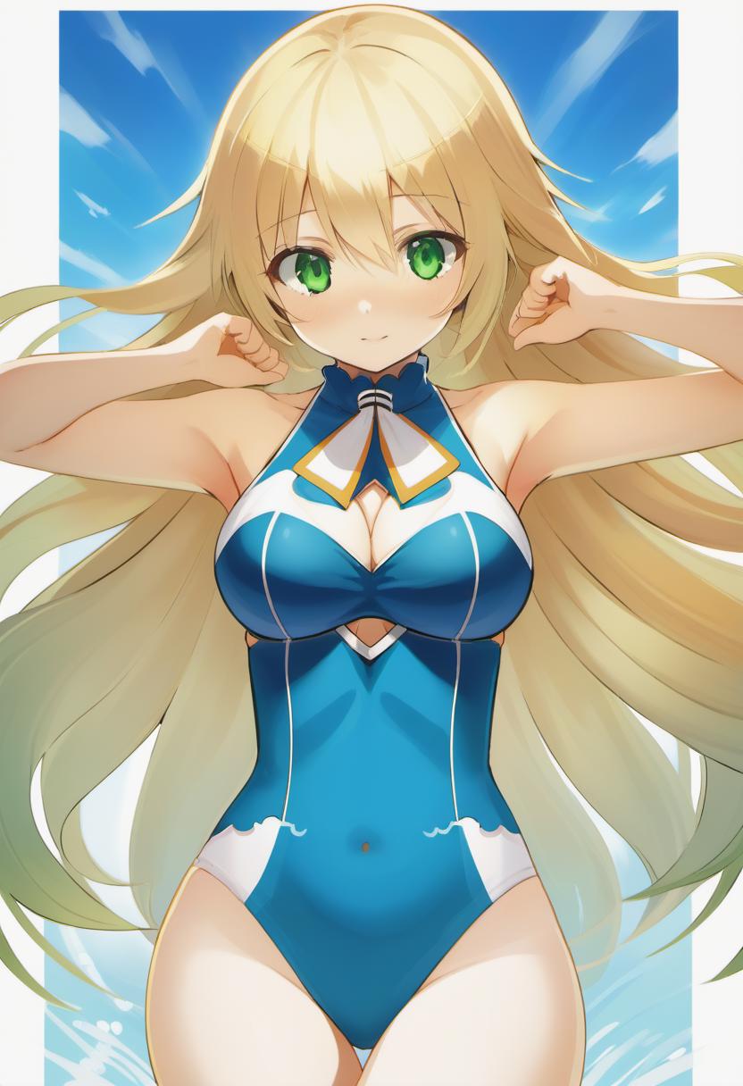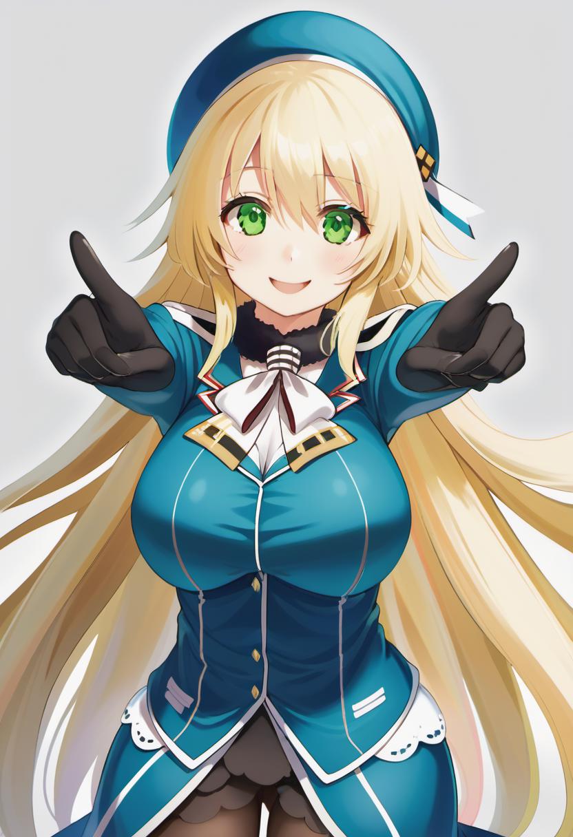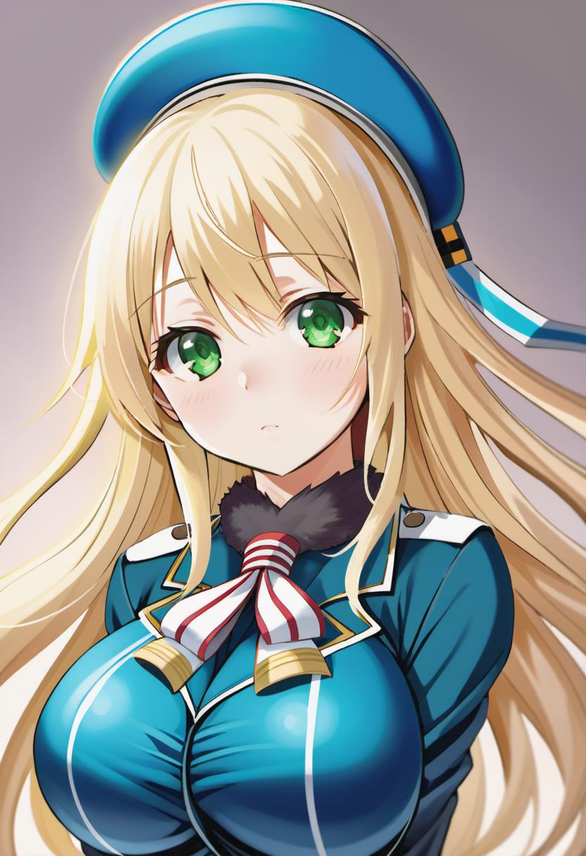 Additional words: blonde, green eyes (or bluish green eyes), beret