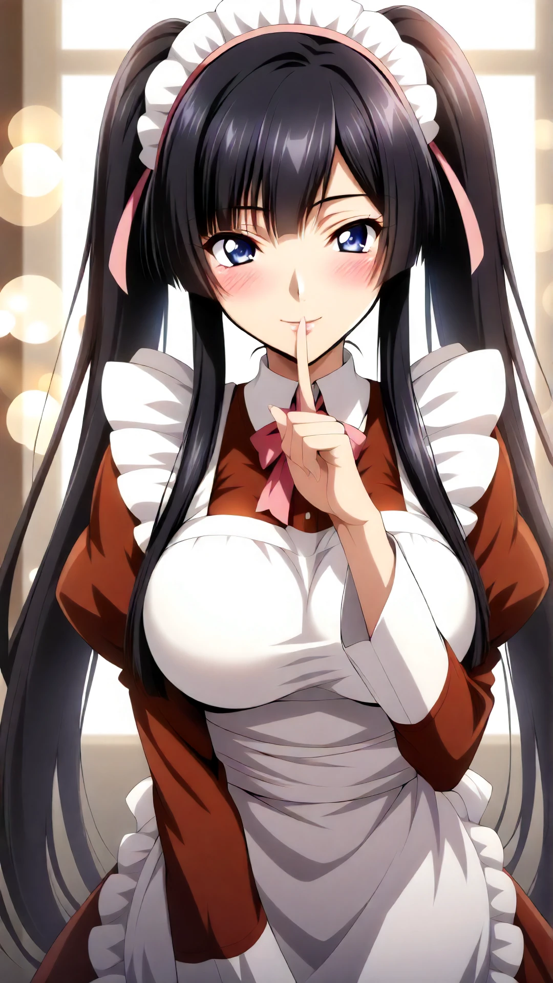 sumeragi_sakuya, an anime girl, 1girl, long hair, breasts, looking at viewer, blush, smile, bangs, blue eyes, blonde hair, large breasts, simple background, black hair, long sleeves, 1boy, white background, dress, twintails, puffy sleeves, wide sleeves, apron, cup, maid, maid headdress, juliet sleeves, white apron, finger to mouth, maid apron, shushing