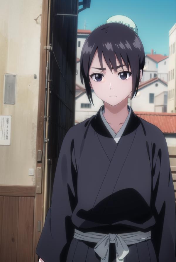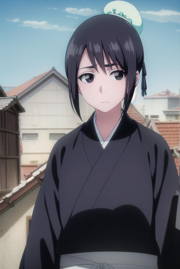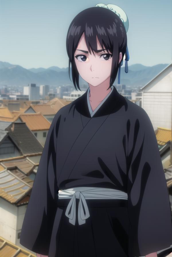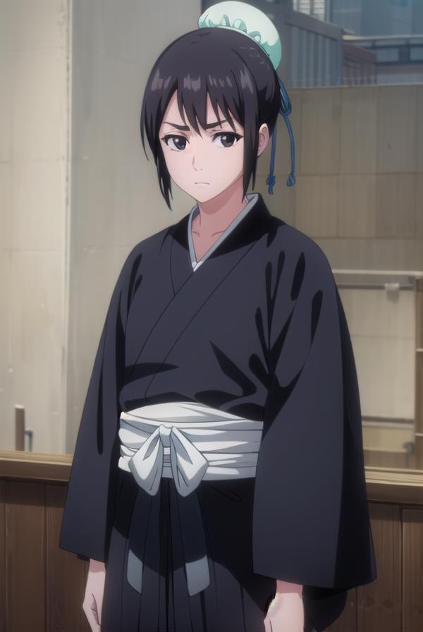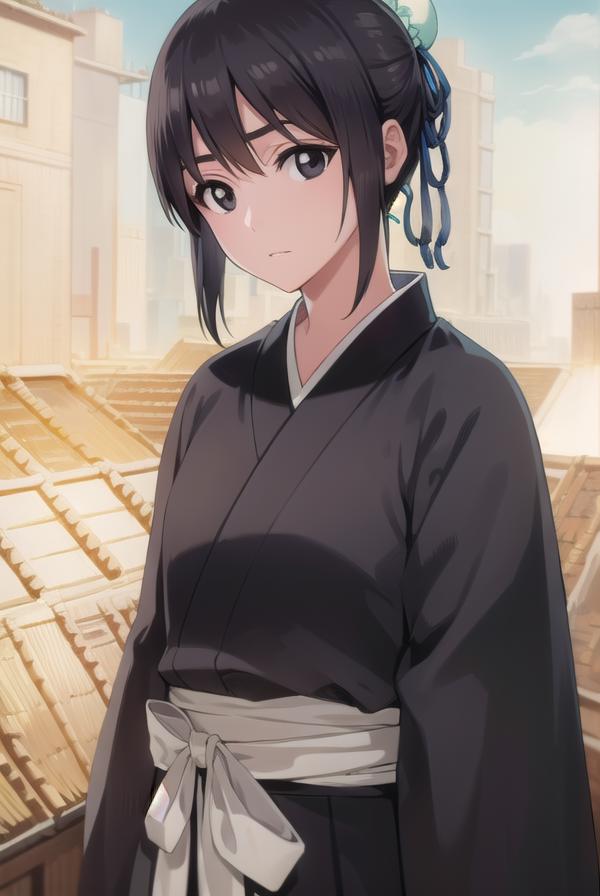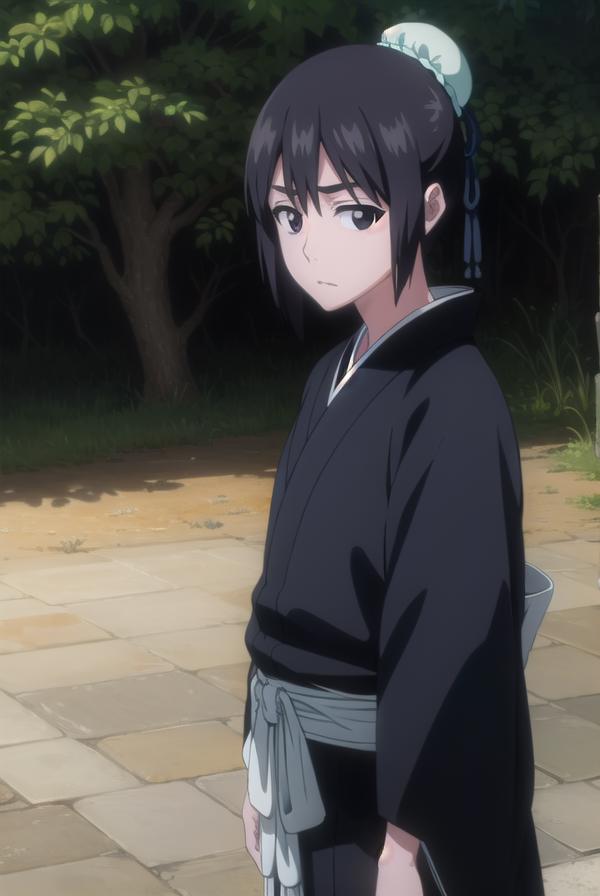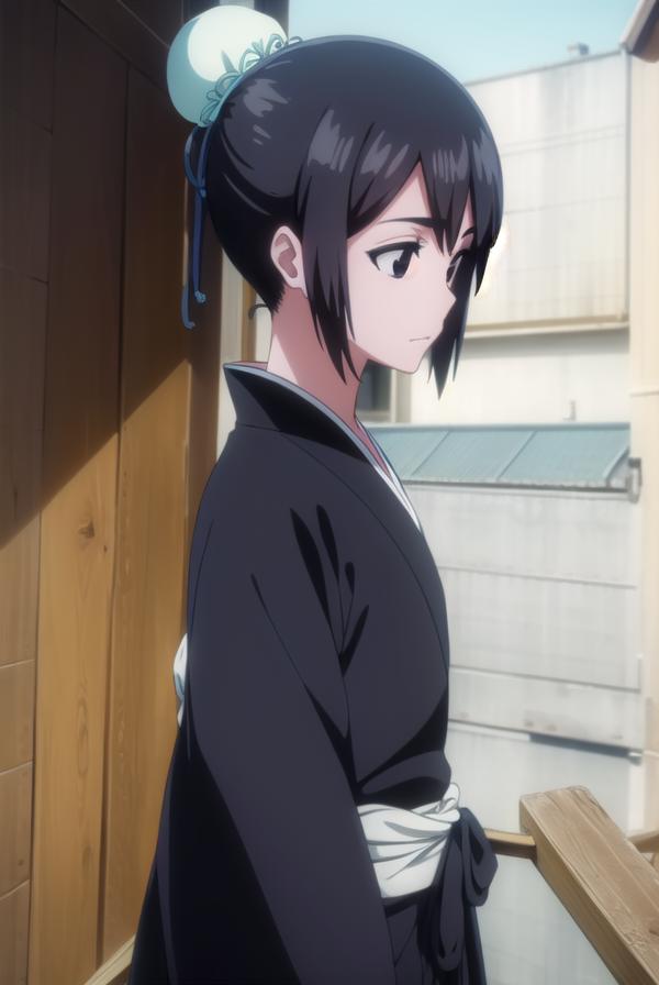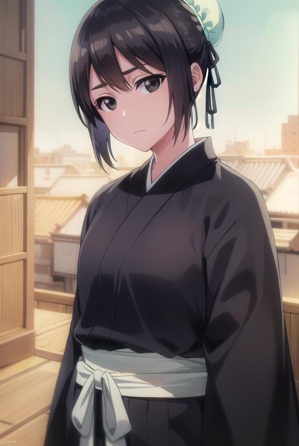 momo hinamori, black hair, hair bun, single hair bun, bun cover, short hair, (black eyes:1.5),