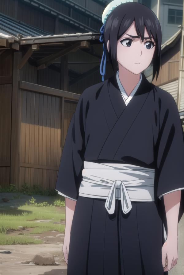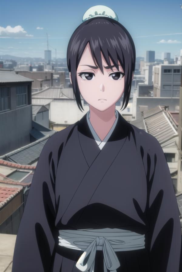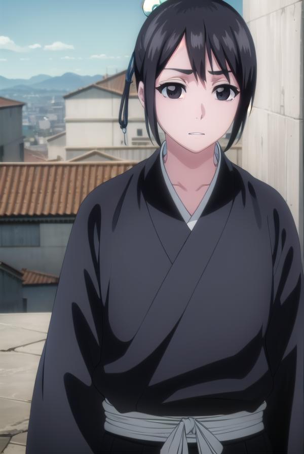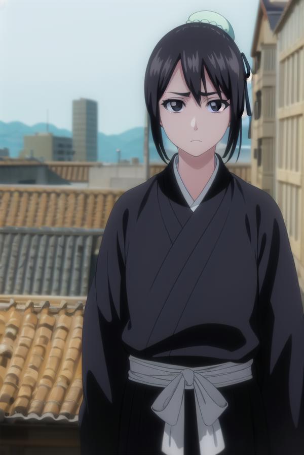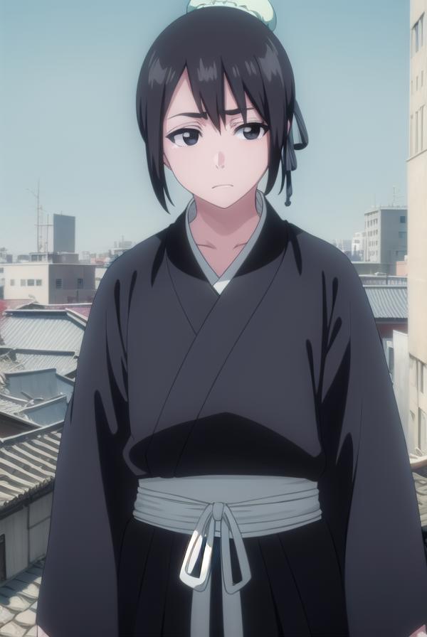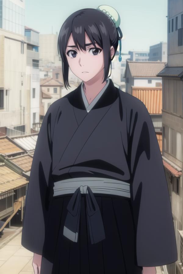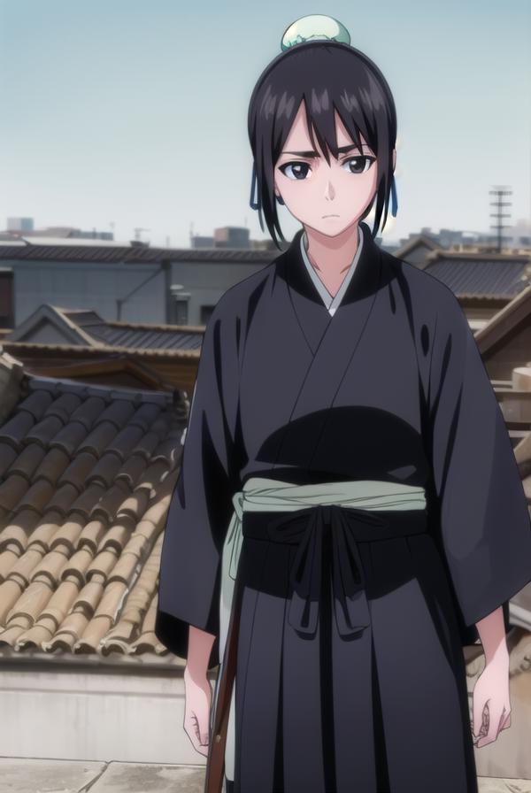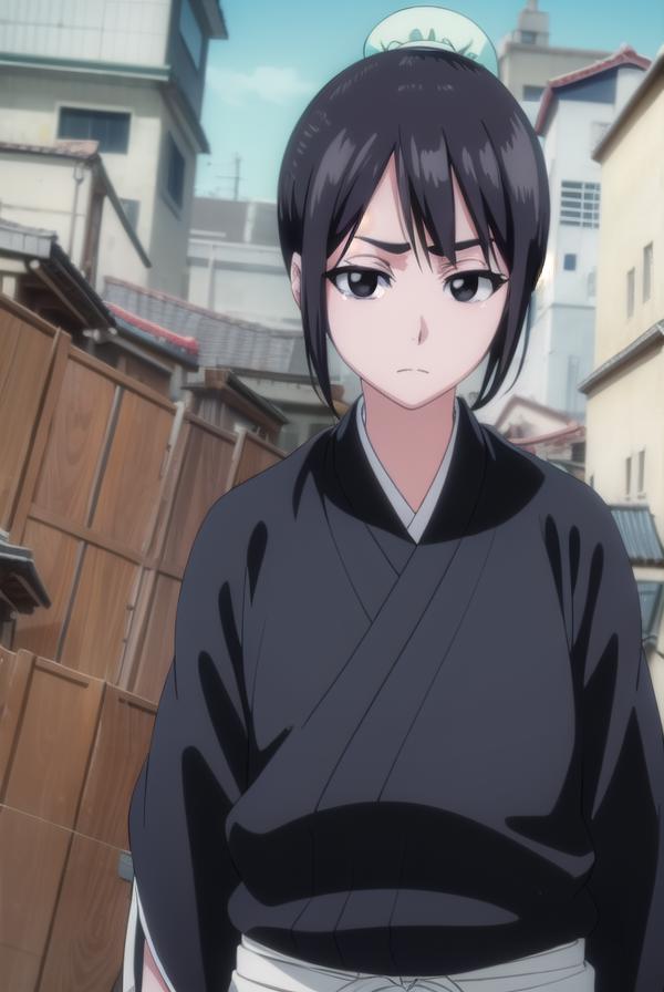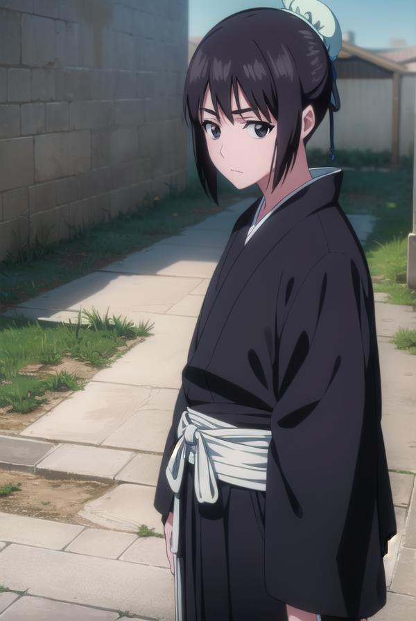 momo hinamori, black hair, hair bun, single hair bun, bun cover, short hair, (black eyes:1.5),