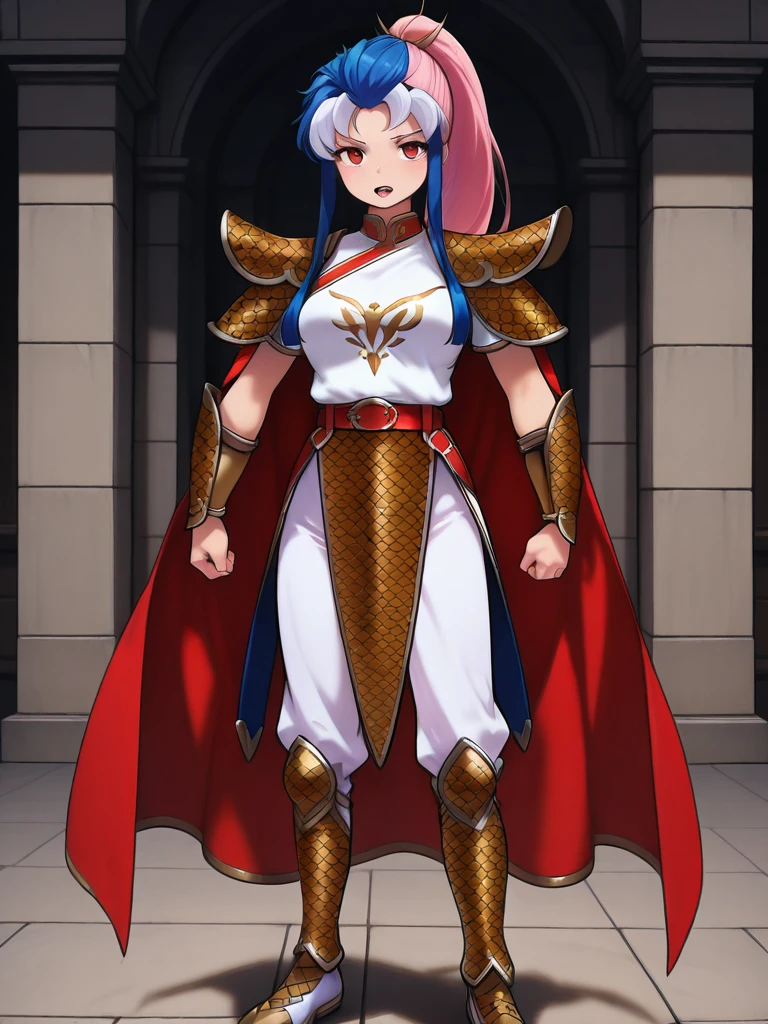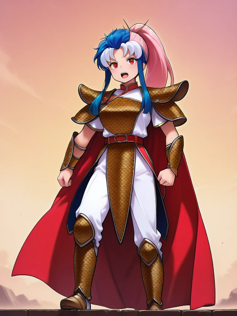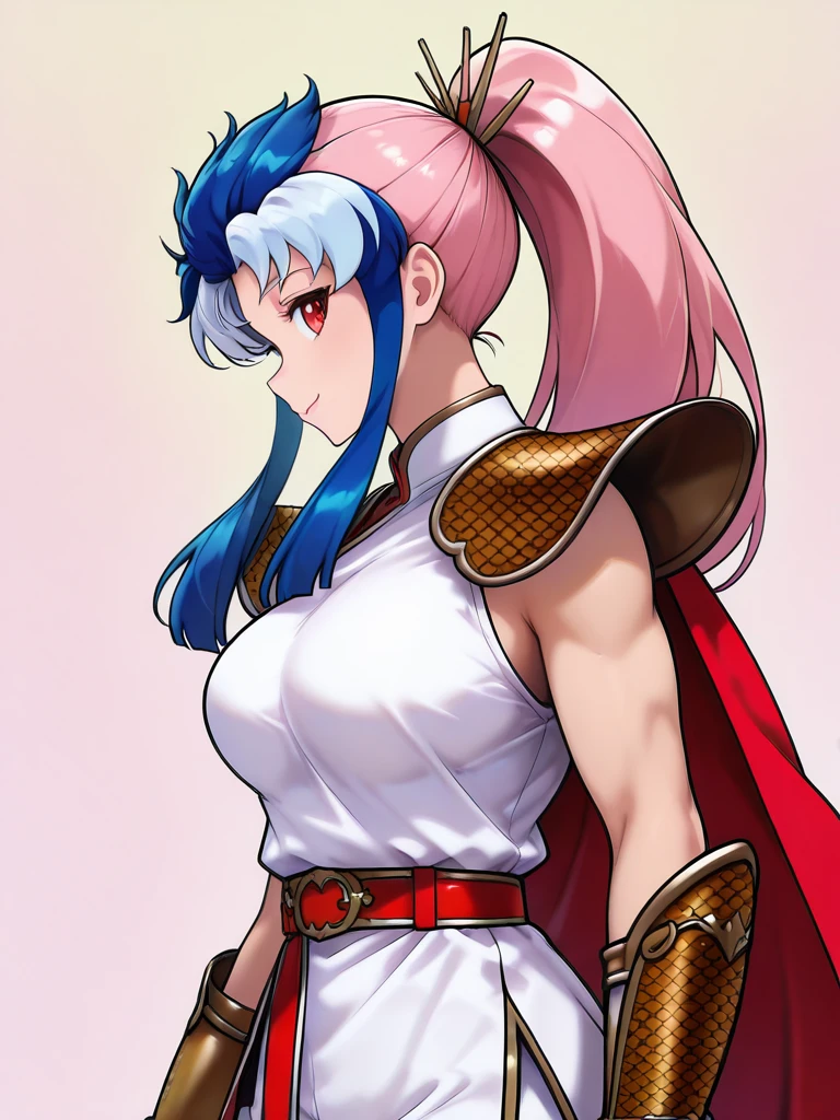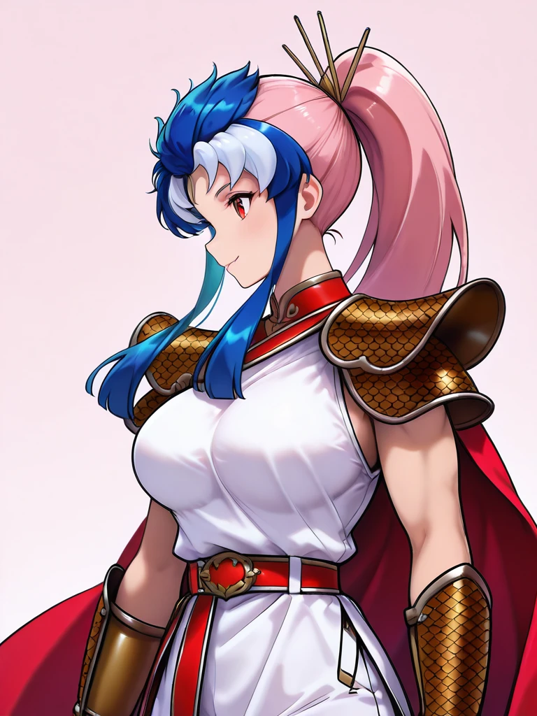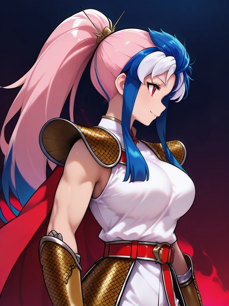 tip, use high weight, 1 to 1.5, specify, blue hair, white bangs, pink ponytail, red eyes, pointy ears.