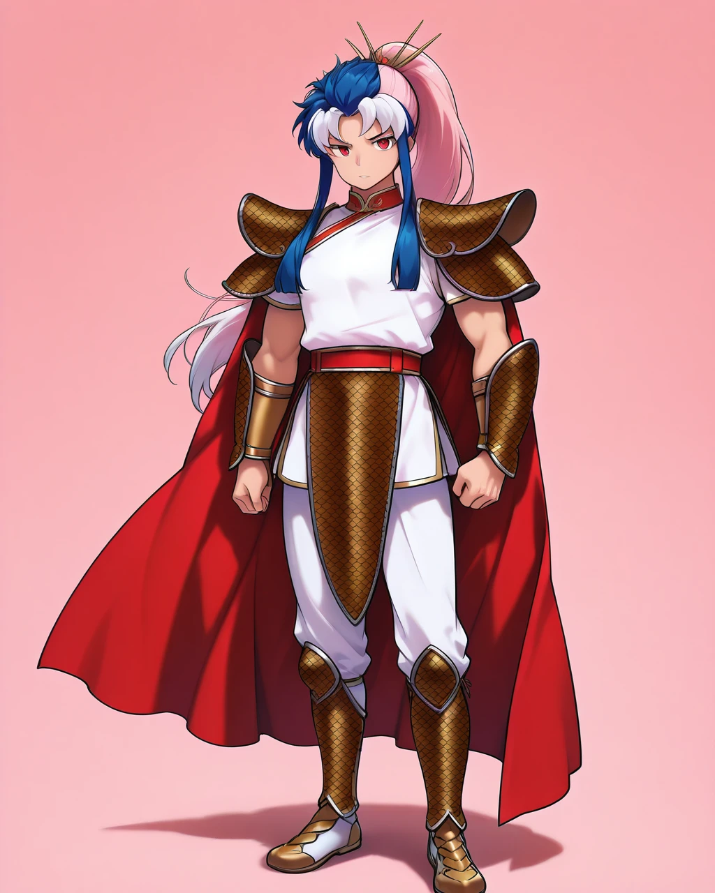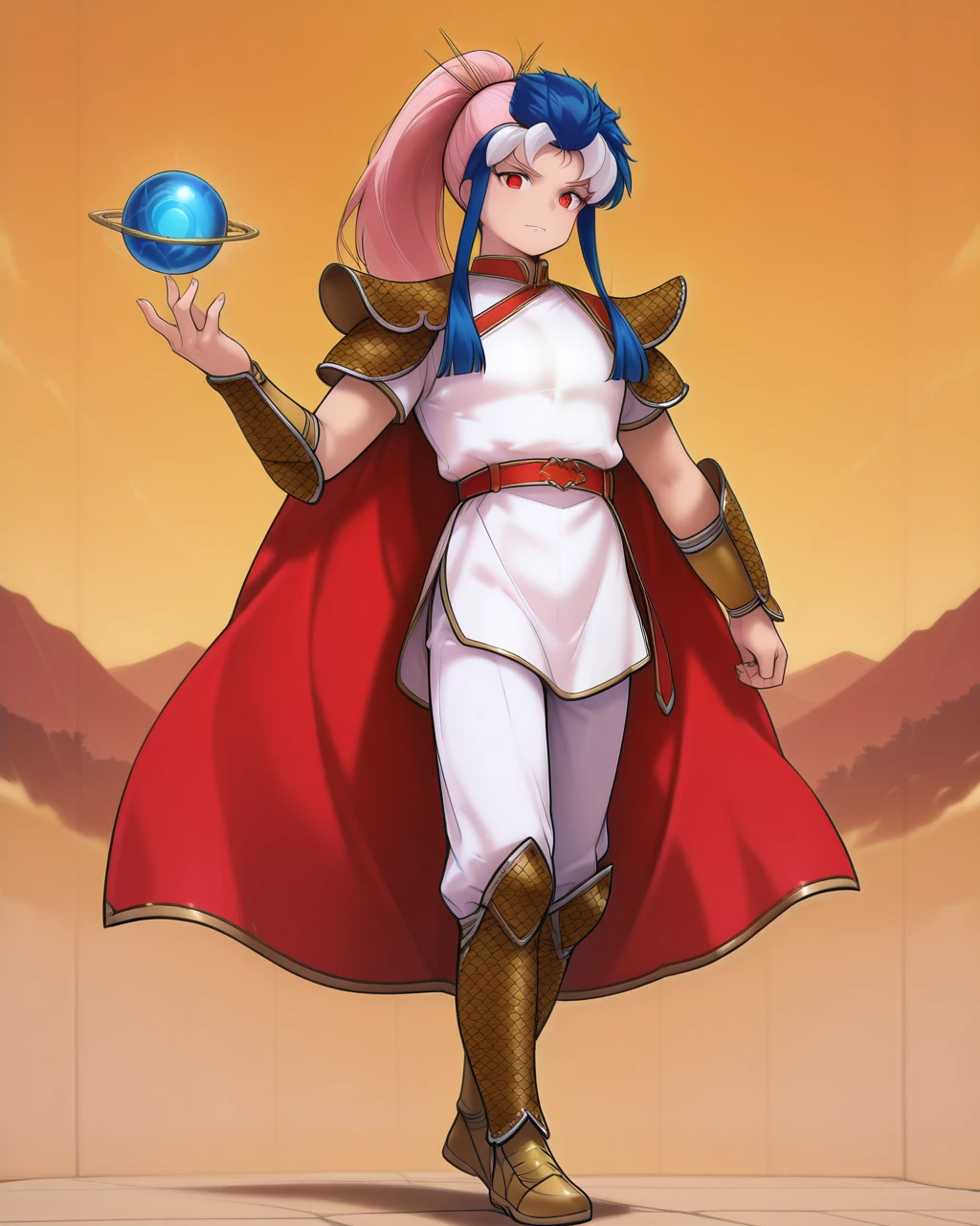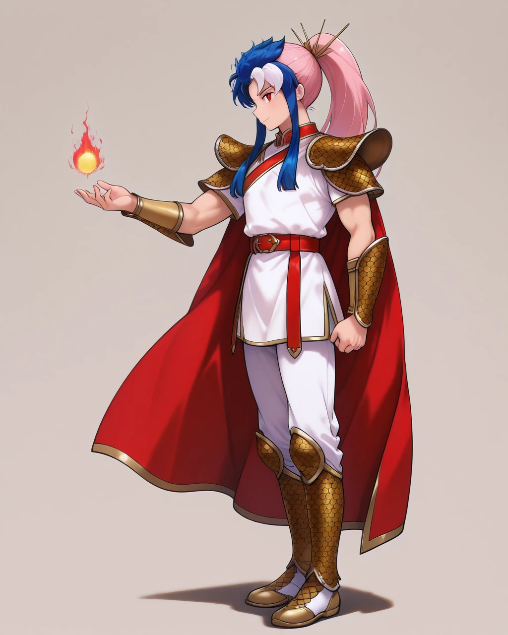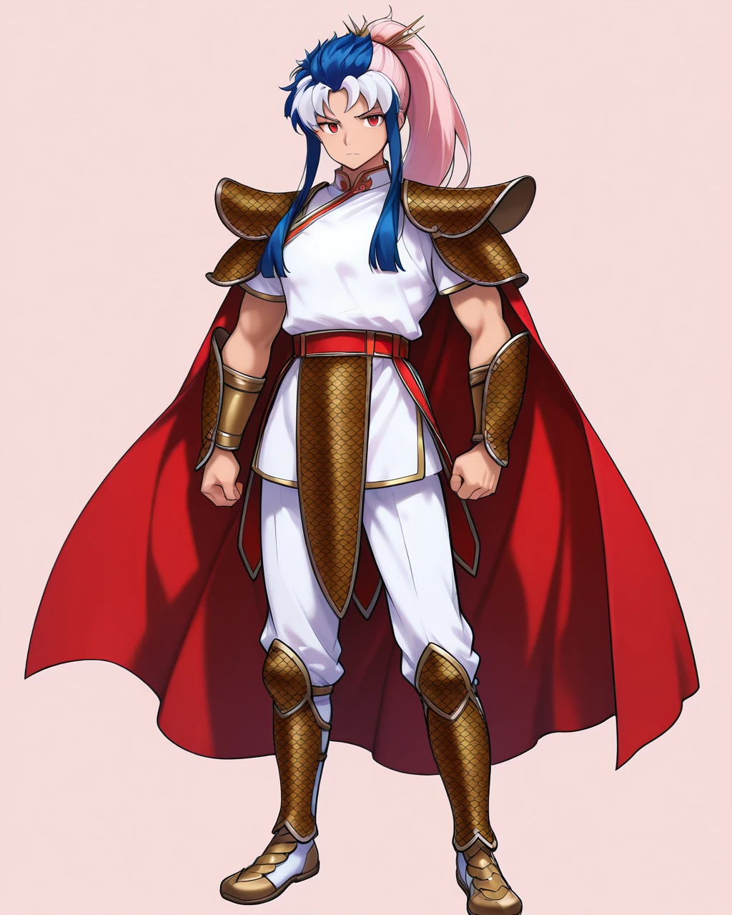For the manga outfit use, armor, shoulder armor, pauldrons, white pants, white robe, red cape, vambraces, bracer, scale armor shoulders, scale armor forearms, scale armor legs