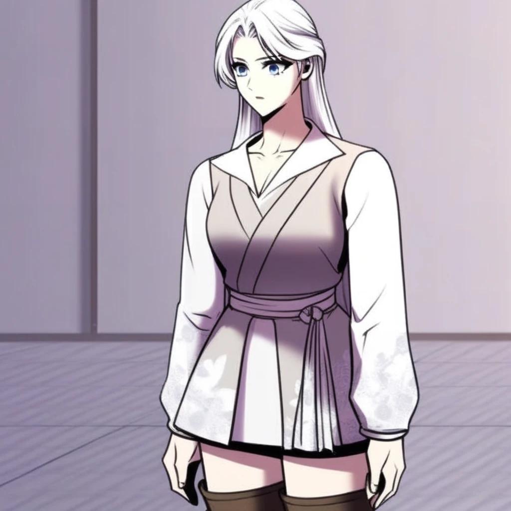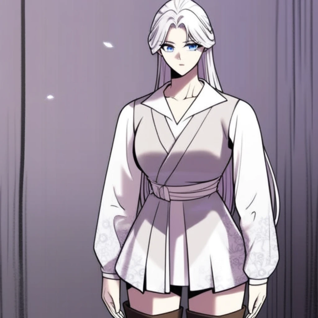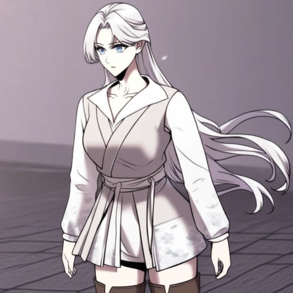 long hair, blue eyes, shirt, long sleeves, dress, short skirt, collarbone, white shirt, white hair, floral print, thigh boots