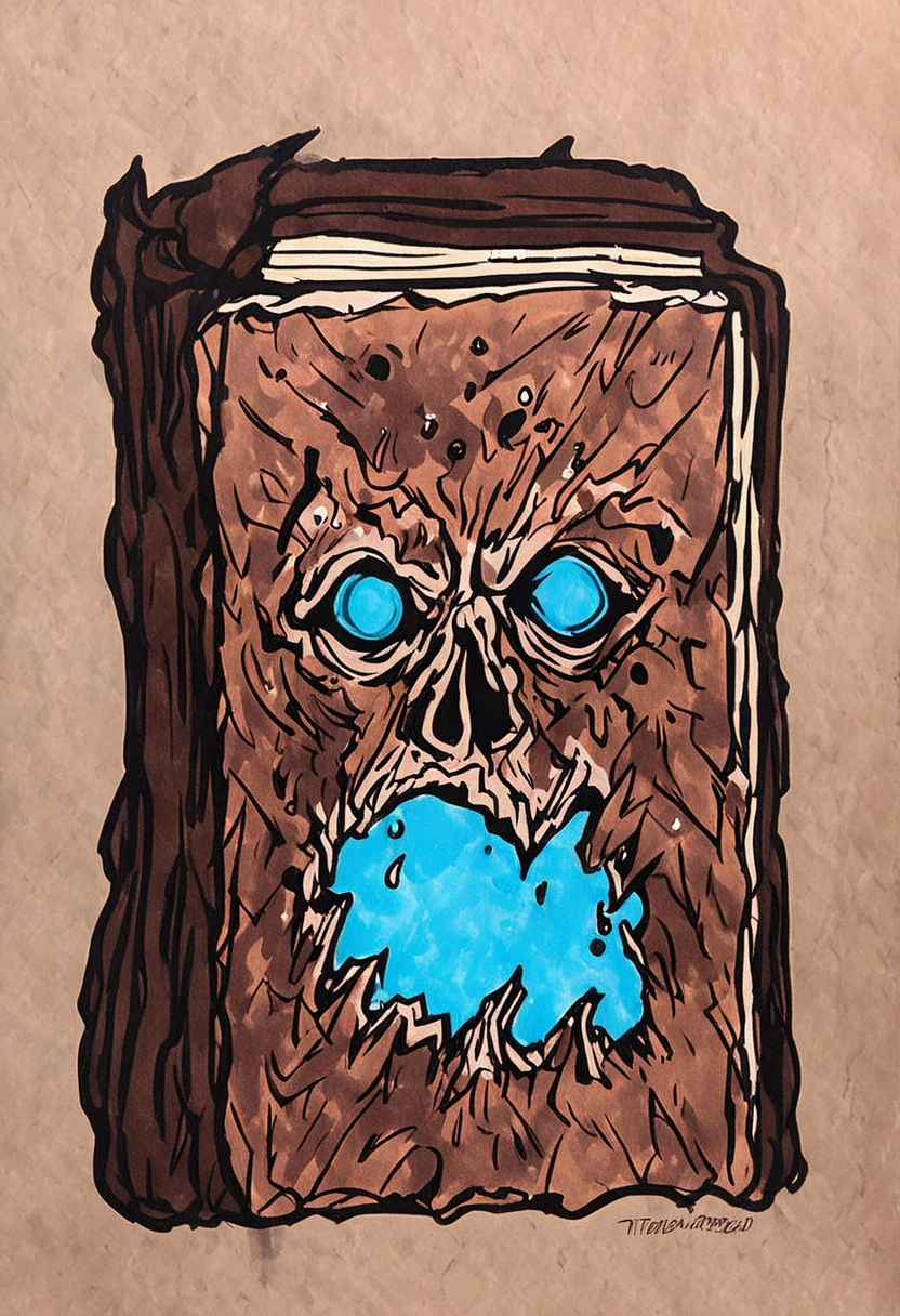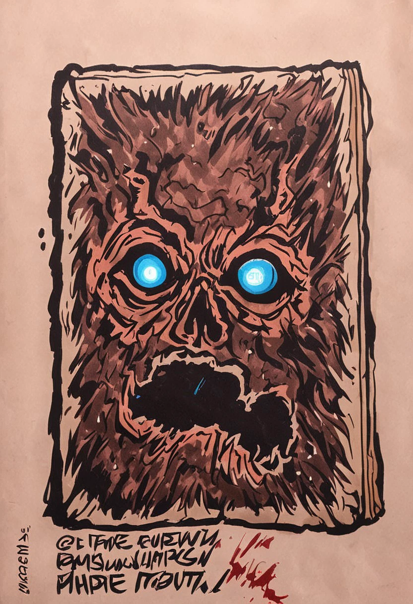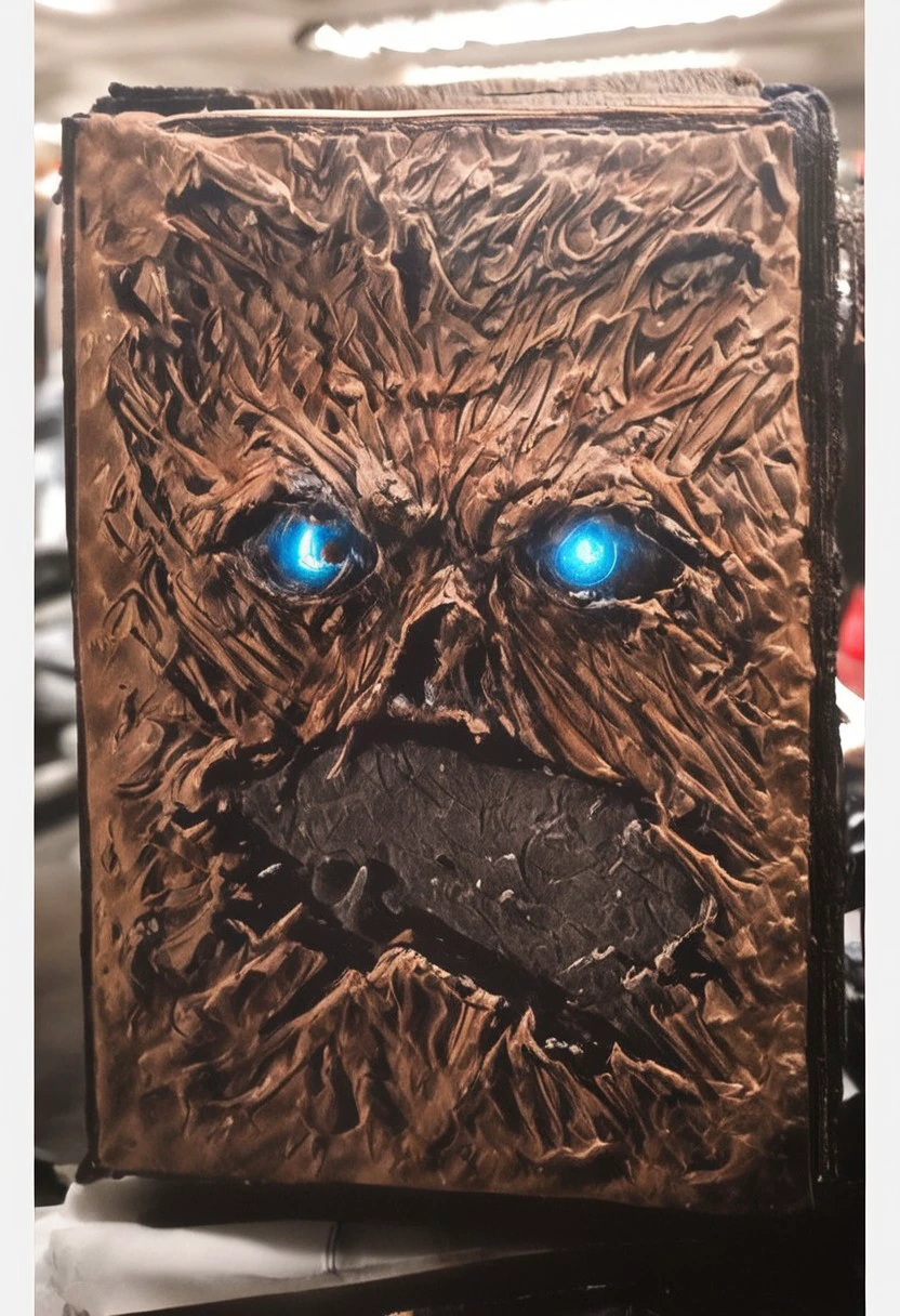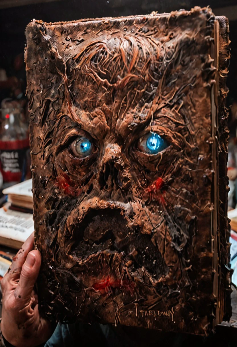 eVIL dEAD bOOK the image is a high-quality dramatic photograph of a woman holding a mysterious dark textured and intricately carved book. the woman who appears to be a woman in her mid-30s to early 40s has a pale complexion and wet matted shoulder-length auburn hair that appears disheveled and dirty. her expression is serious and focused as she gazes intently at the book. her blue eyes stand out prominently against the grime on her face. she is dressed in a tattered light green long-sleeved shirt with visible stains and dirt suggesting she might have been through a rough ordeal or environment. the book she holds is old and worn featuring intricate carvings on the cover that depict a demonic or monstrous face with bulging distorted features including eyes mouth and a menacing expression. the background is a dimly lit nondescript possibly industrial space with a low ceiling and white industrial piping visible on the walls. evil book detailed book book focused solo blue eyes 1girl brown hair painting (object) holding blurry parody long hair blood wet realistic scene reference upper body old book two-sided text book page with detailed alchemy symbols glowing magical potion phoenix mystical runes ornate ancient text decorative borders parchment background aged texture