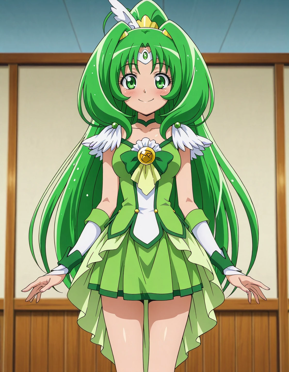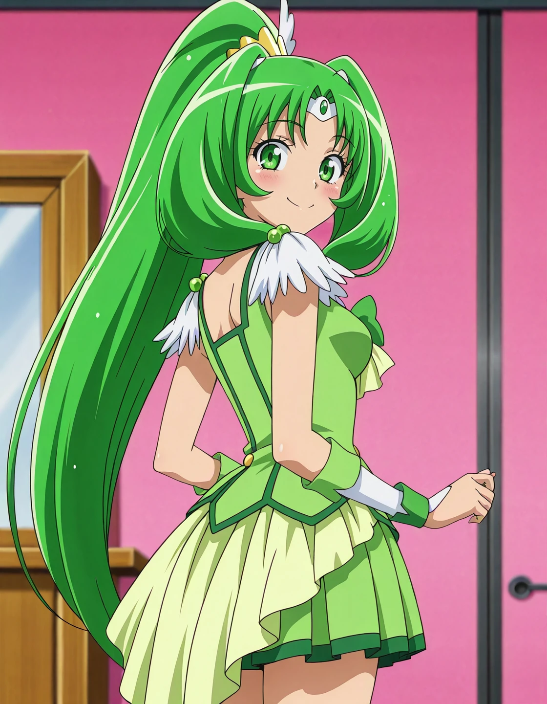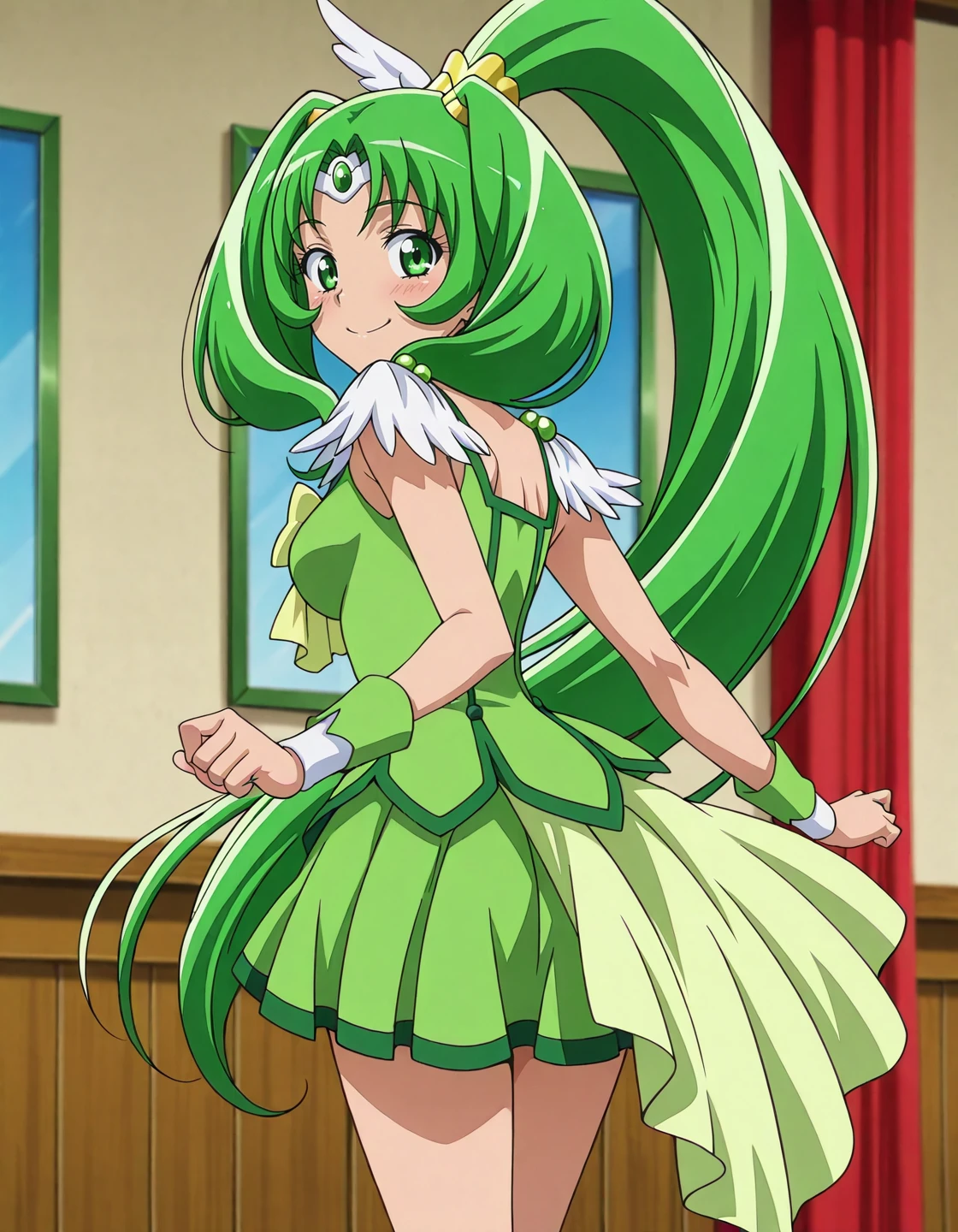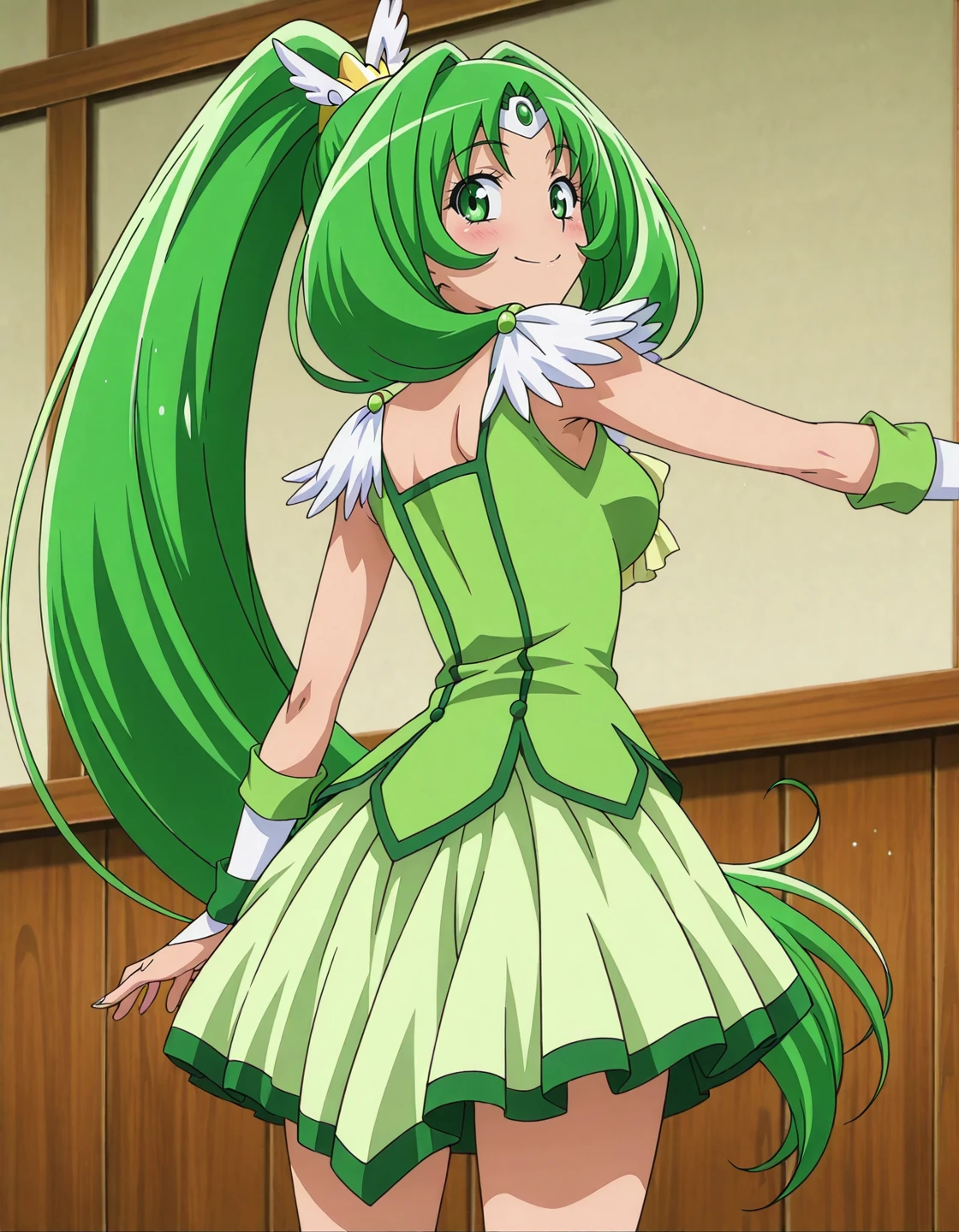 anime screencap, solo,1girl,curemarch,marchcostume,green skirt,<lora:curemarch_IL:0.8> high definition,amazing quality,best quality,very aesthetic,masterpiece,absurdres,