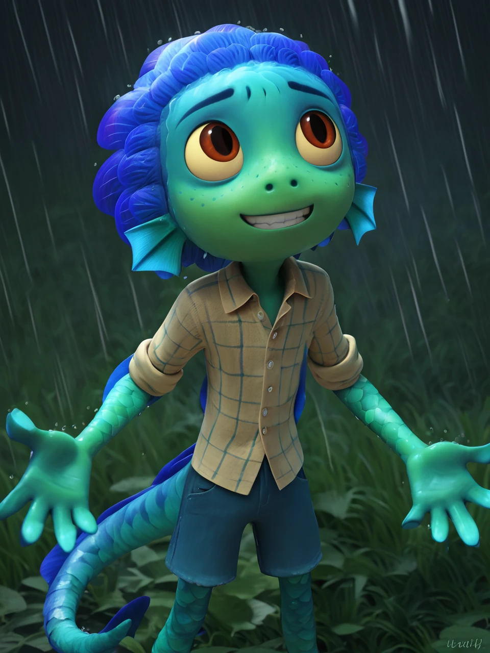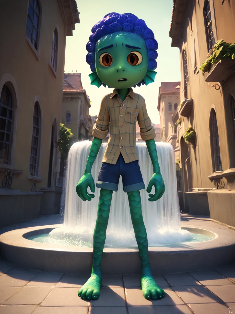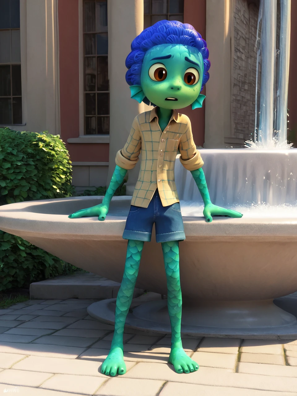 MonstrLuca, 1boy, solo, brown eyes, colored skin, shorts, plaid shirt, collared shirt, sleeves rolled up, tail,