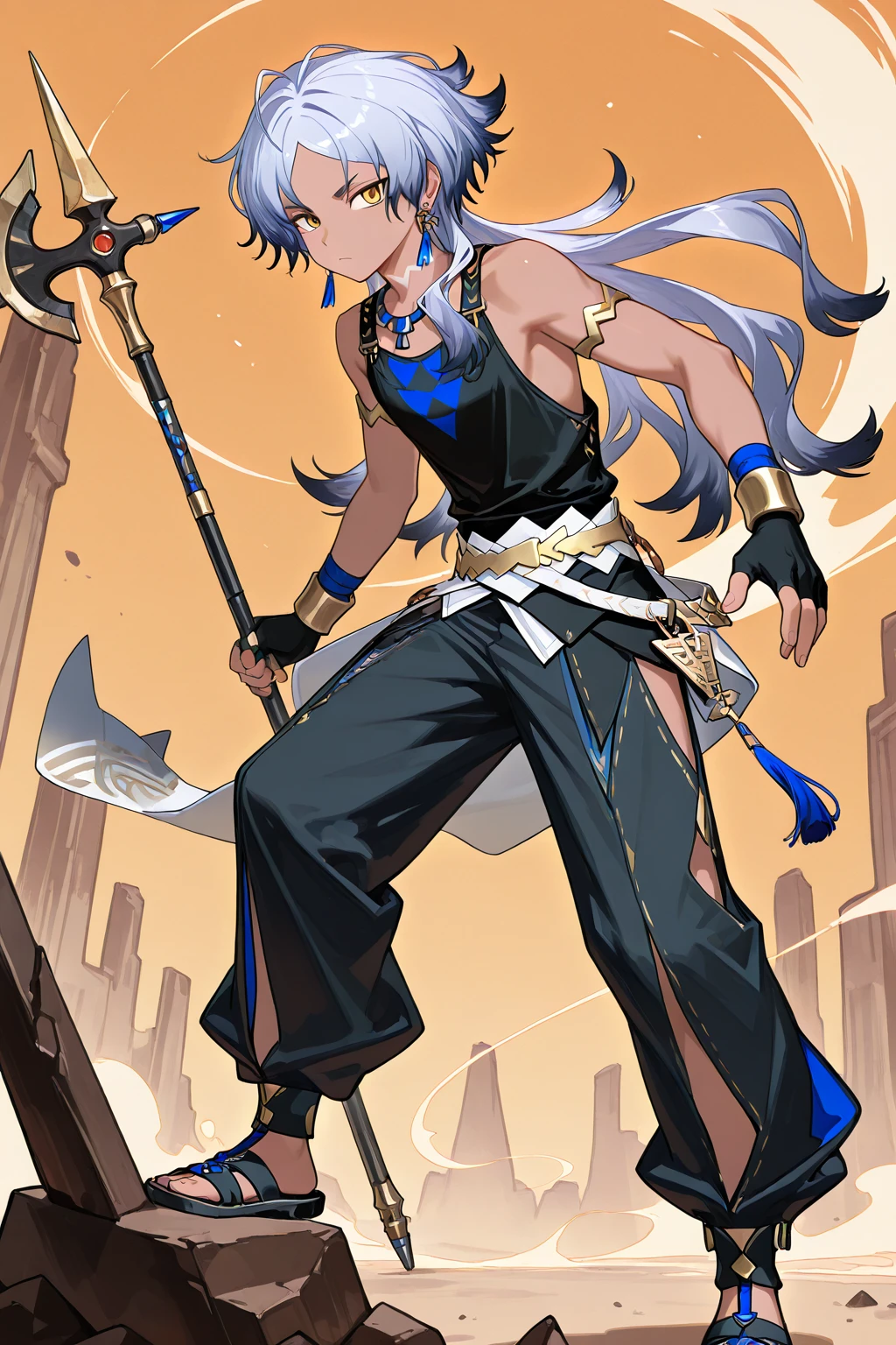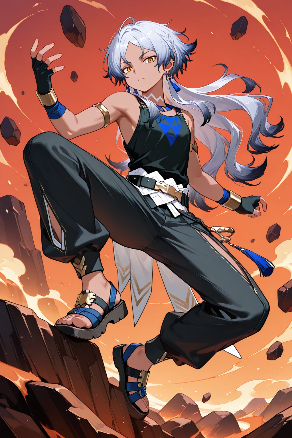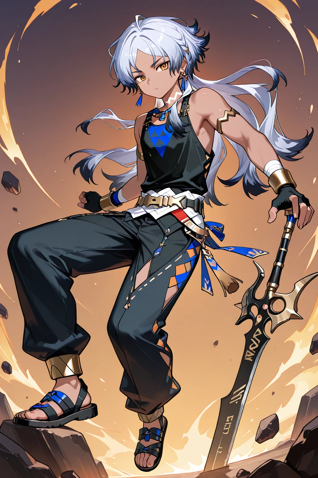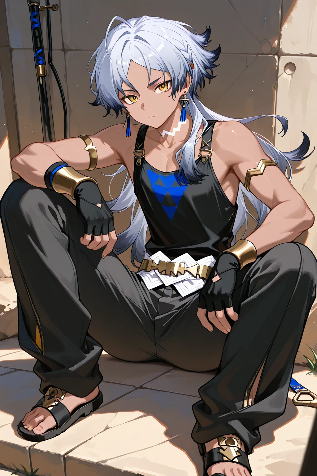 sandreckoner, black tank top, dark-skinned male, earrings, grey hair, jewelry, long hair,multicolored hair, yellow eyes, long hair, pants, fingerless_gloves, earrings, armlet, tassel, sandals, belt,