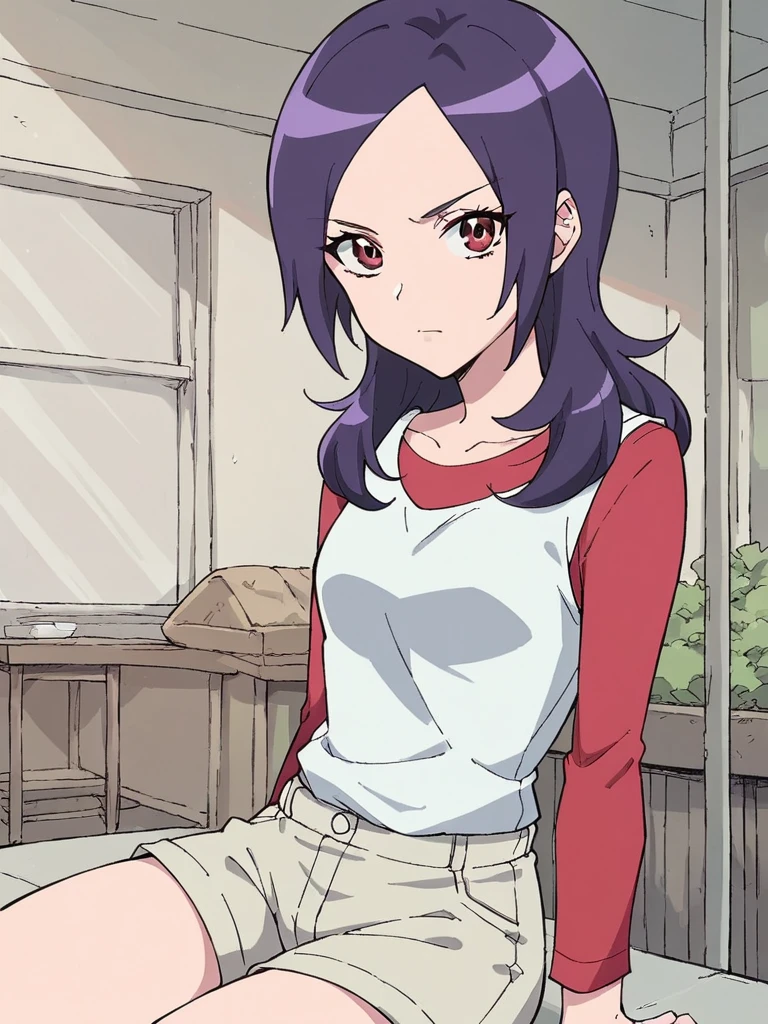 higashi setsuna, dark purple hair, red eyes, parted bangs,