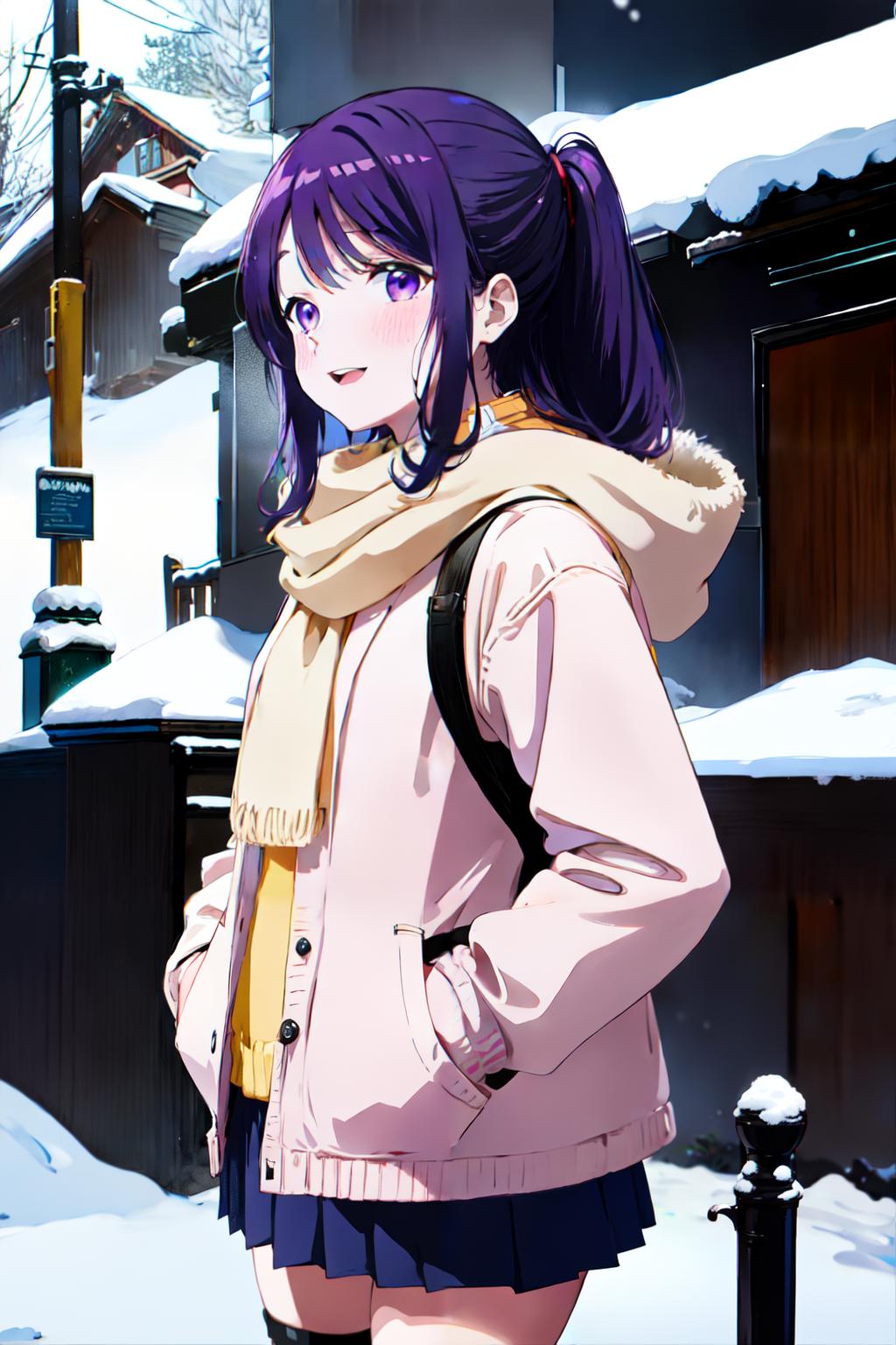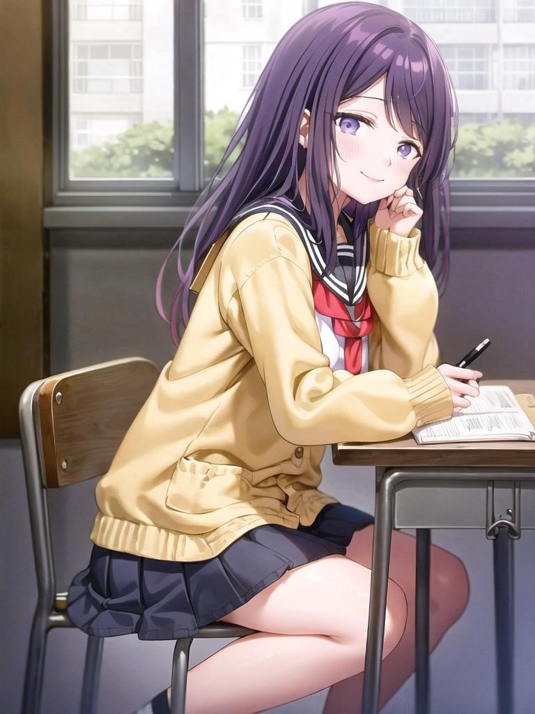 📌Prompt:Nagisa Kubo, purple hair, purple eyes, black sailor collar, school uniform, serafuku, white shirt, red neckerchief, black pleated skirt, (brown cardigan:1.1), open cardigan, long sleeves
